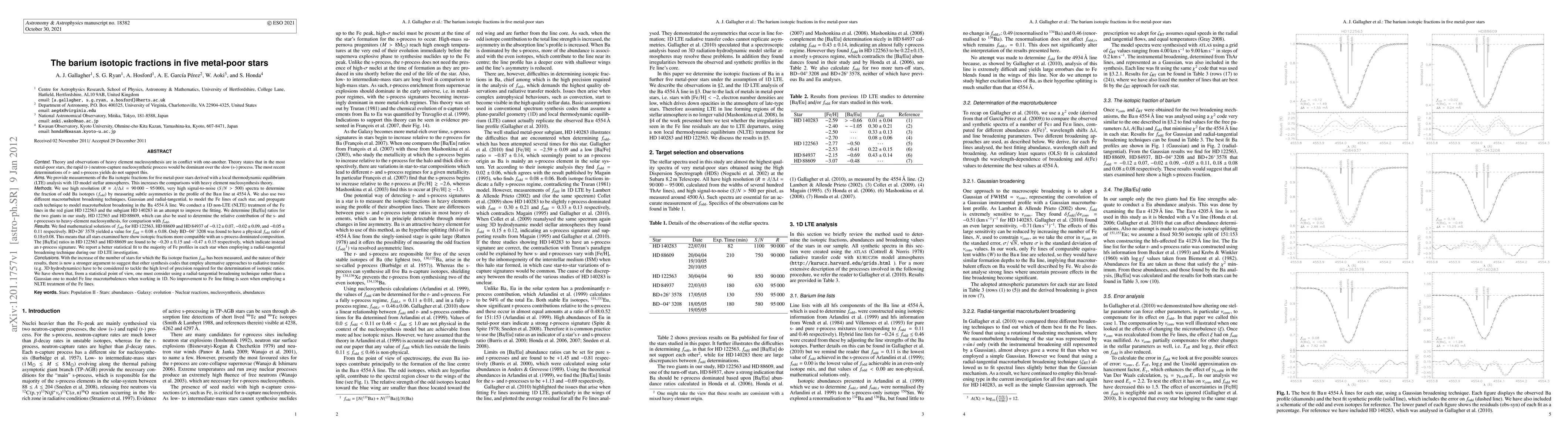 This study measures barium isotopic fractions in five metal-poor stars using high-resolution spectra and finds that the stars exhibit isotopic compositions consistent with an s-process dominated nucleosynthesis. The research also suggests that a radial-tangential broadening technique provides a better fit for modeling iron line macroturbulence compared to Gaussian broadening.