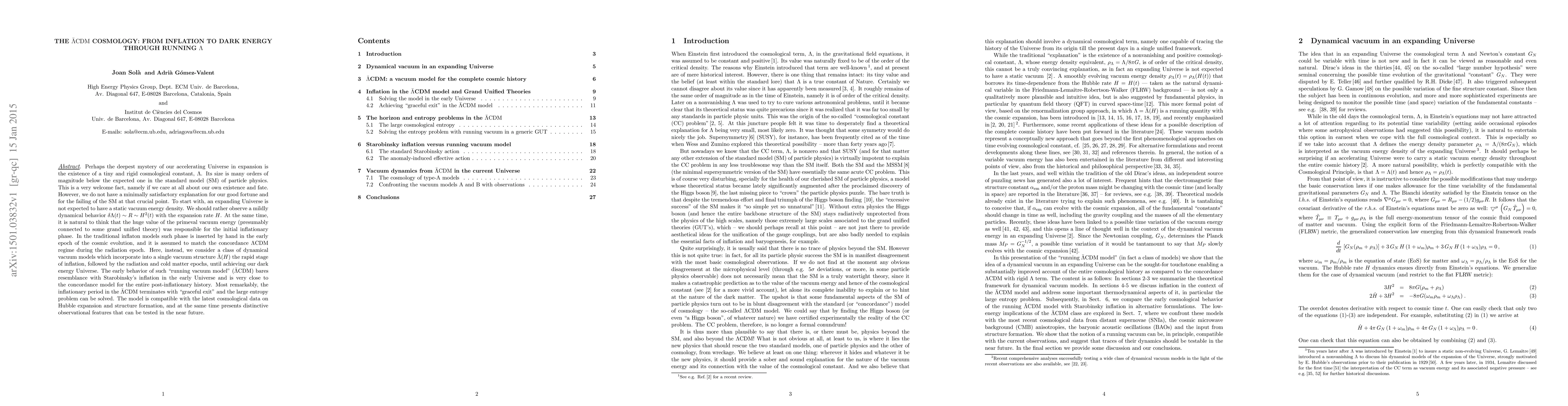 Perhaps the deepest mystery of our accelerating Universe in expansion is the existence of a tiny and rigid cosmological constant, $\Lambda$. Its size is many orders of magnitude below the expected one in the standard model of particle physics. However, an expanding Universe is not expected to have a static vacuum energy density. We should rather observe a mildly dynamical behavior $\delta\Lambda(t)\sim R\sim H^2(t)$ with the expansion rate $H$. At the same time, it is natural to think that the huge value of the primeval vacuum energy (presumably connected to some grand unified theory) was responsible for the initial inflationary phase. In the traditional inflaton models such phase is inserted by hand in the early epoch of the cosmic evolution, and it is assumed to match the concordance $\Lambda$CDM regime during the radiation epoch. Here, instead, we consider a class of dynamical vacuum models which incorporate into a single vacuum structure $\bar{\Lambda}(H)$ the rapid stage of inflation, followed by the radiation and cold matter epochs, until achieving our dark energy Universe. The early behavior of the model bares resemblance with Starobinsky's inflation and ptovides a solution to the large entropy problem. It is compatible with the latest cosmological data on Hubble expansion and structure formation, and presents distinctive observational features that can be tested in the near future.