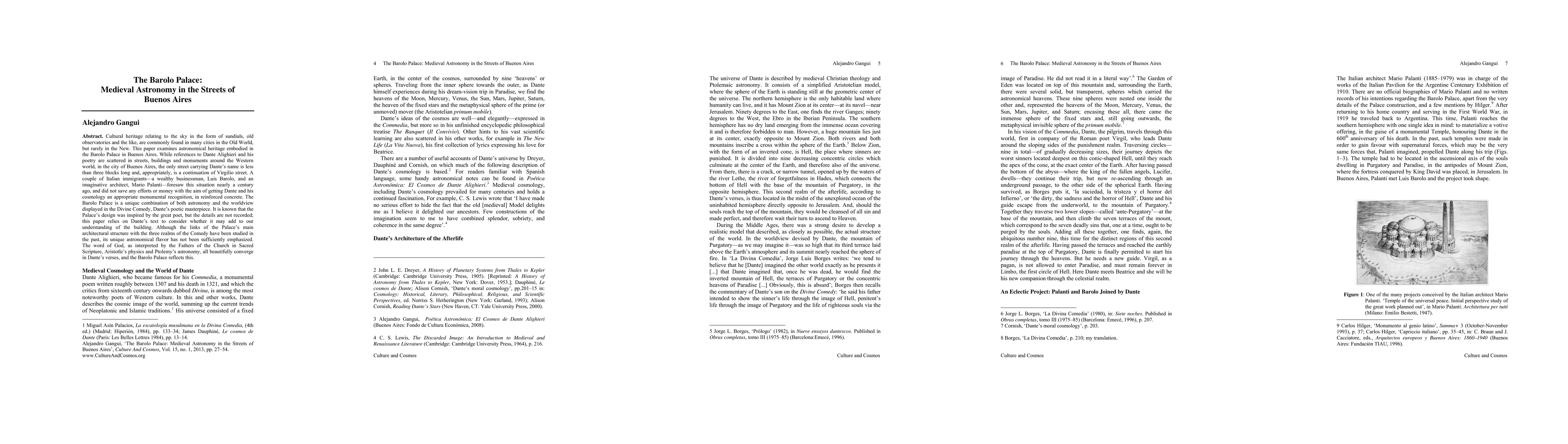 This paper explores the astronomical heritage embedded in the Barolo Palace in Buenos Aires, designed by architect Mario Palanti for businessman Luis Barolo. It examines how the Palace integrates Dante Alighieri's cosmology from "The Divine Comedy," merging medieval astronomy with the building's structure, and highlights its unique representation of the confluence of Church doctrine, Aristotelian physics, and Ptolemaic astronomy.