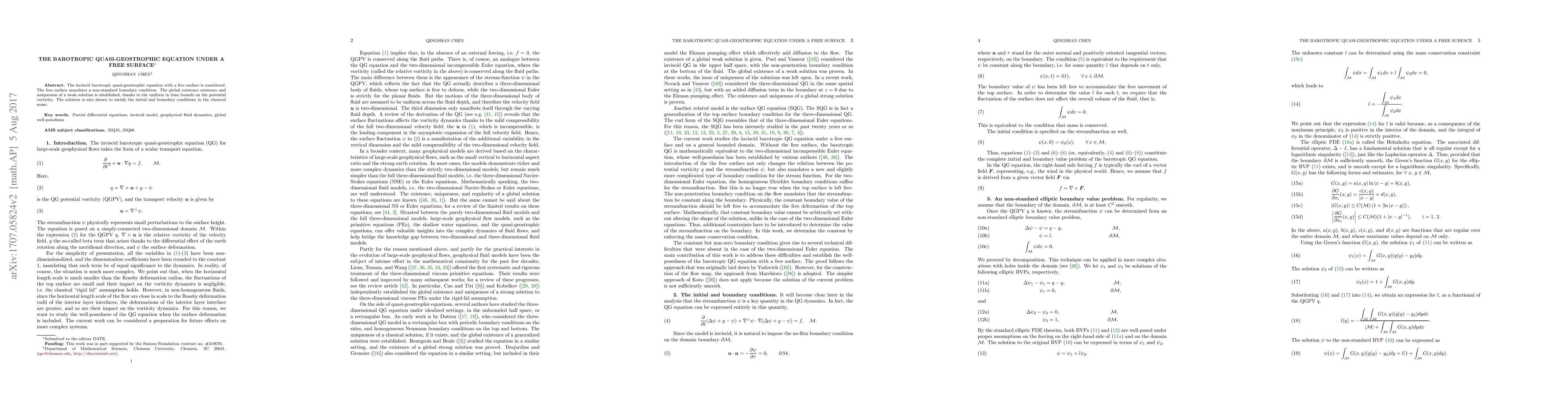 This paper establishes global existence and uniqueness of a weak solution for the inviscid barotropic quasi-geostrophic equation with a free surface, utilizing uniform in time bounds on potential vorticity. The solution satisfies initial and boundary conditions in the classical sense.