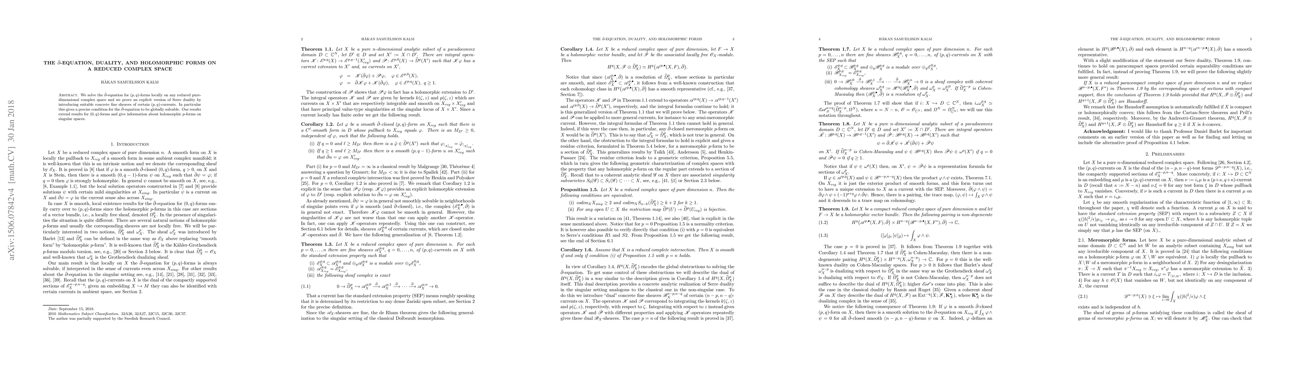 We solve the $\bar{\partial}$-equation for $(p,q)$-forms locally on any reduced pure-dimensional complex space and we prove an explicit version of Serre duality by introducing suitable concrete fine sheaves of certain $(p,q)$-currents. In particular this gives a precise condition for the $\bar{\partial}$-equation to be globally solvable. Our results extend results for $(0,q)$-forms and give information about holomorphic $p$-forms on singular spaces.