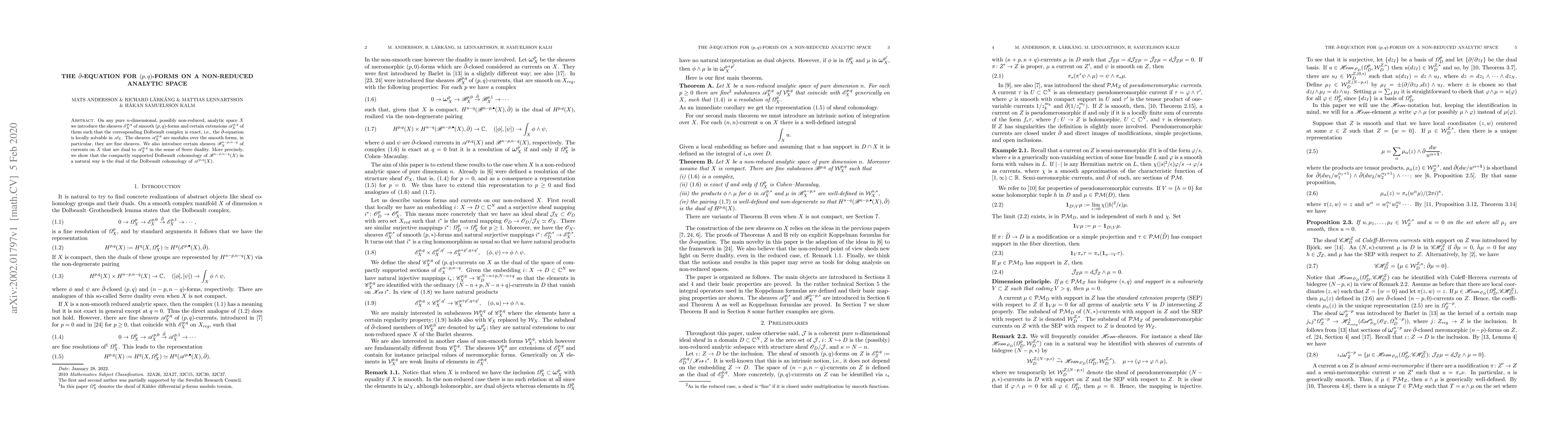 On any pure $n$-dimensional, possibly non-reduced, analytic space $X$ we introduce the sheaves $\mathscr{E}_X^{p,q}$ of smooth $(p,q)$-forms and certain extensions $\mathscr{A}_X^{p,q}$ of them such that the corresponding Dolbeault complex is exact, i.e., the $\bar\partial$-equation is locally solvable in $\mathscr{A}_X$. The sheaves $\mathscr{A}_X^{p,q}$ are modules over the smooth forms, in particular, they are fine sheaves. We also introduce certain sheaves $\mathscr{B}_X^{n-p,n-q}$ of currents on $X$ that are dual to $\mathscr{A}_X^{p,q}$ in the sense of Serre duality. More precisely, we show that the compactly supported Dolbeault cohomology of $\mathscr{B}^{n-p,n-q}(X)$ in a natural way is the dual of the Dolbeault cohomology of $\mathscr{A}^{p,q}(X)$.