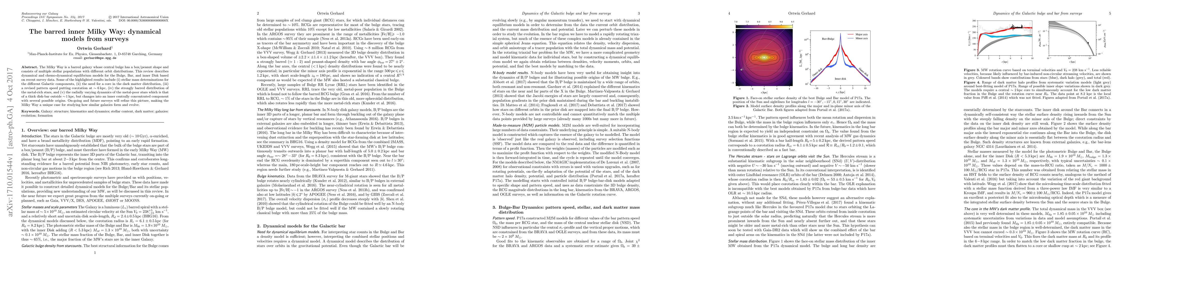 This paper reviews dynamical models of the Milky Way's barred structure, highlighting recent survey data that reveal stellar mass distributions, the necessity of a core in dark matter, and a revised pattern speed for corotation. It also discusses the distinct dynamics of metal-rich and metal-poor stars, suggesting varied origins for the latter.