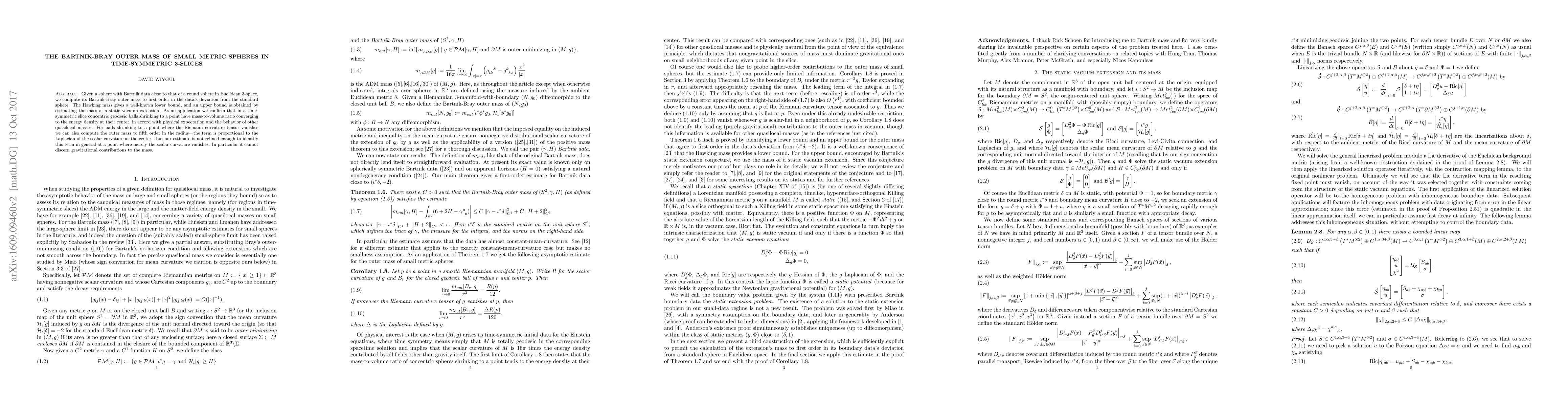 Given a sphere with Bartnik data close to that of a round sphere in Euclidean 3-space, we compute its Bartnik-Bray outer mass to first order in the data's deviation from the standard sphere. The Hawking mass gives a well-known lower bound, and an upper bound is obtained by estimating the mass of a static vacuum extension. As an application we confirm that in a time-symmetric slice concentric geodesic balls shrinking to a point have mass-to-volume ratio converging to the energy density at their center, in accord with physical expectation and the behavior of other quasilocal masses. For balls shrinking to a flat point we can also compute the outer mass to fifth order in the radius---the term is proportional to the Laplacian of the scalar curvature at the center---but our estimate is not refined enough to identify this term at a point which is merely scalar flat. In particular it cannot discern gravitational contributions to the mass.