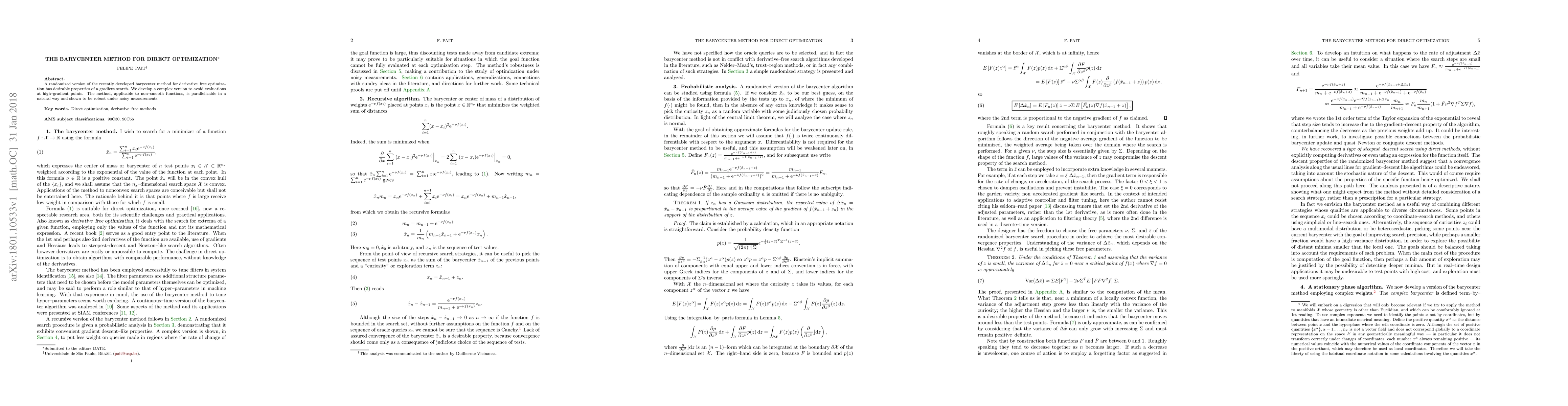A randomized version of the recently developed barycenter method for derivative-free optimization has desirable properties of a gradient search. We develop a complex version to avoid evaluations at high-gradient points. The method, applicable to non-smooth functions, is parallelizable in a natural way and shown to be robust under noisy measurements.