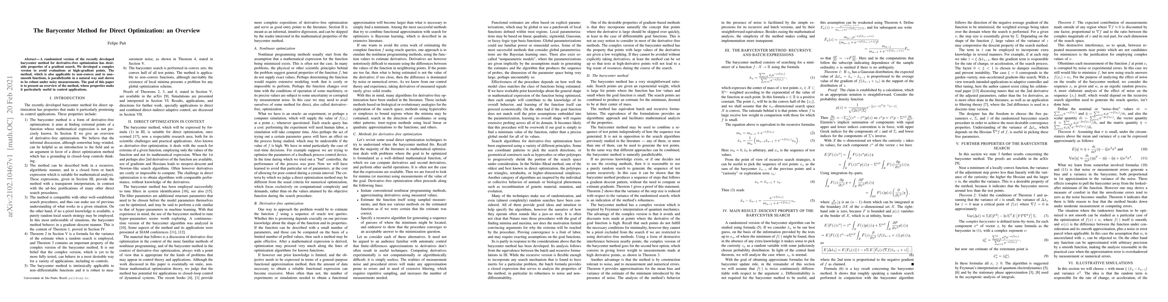 A randomized version of the recently developed barycenter method for derivative--free optimization has desirable properties of a gradient search. We developed a complex version to avoid evaluations at high--gradient points. The method, which is also applicable to non--convex and to non--smooth functions, is parallelizable in a natural way and shown to be robust under noisy measurements. The goal of this paper is to present an overview of the method, whose properties make it particularly useful in control applications.