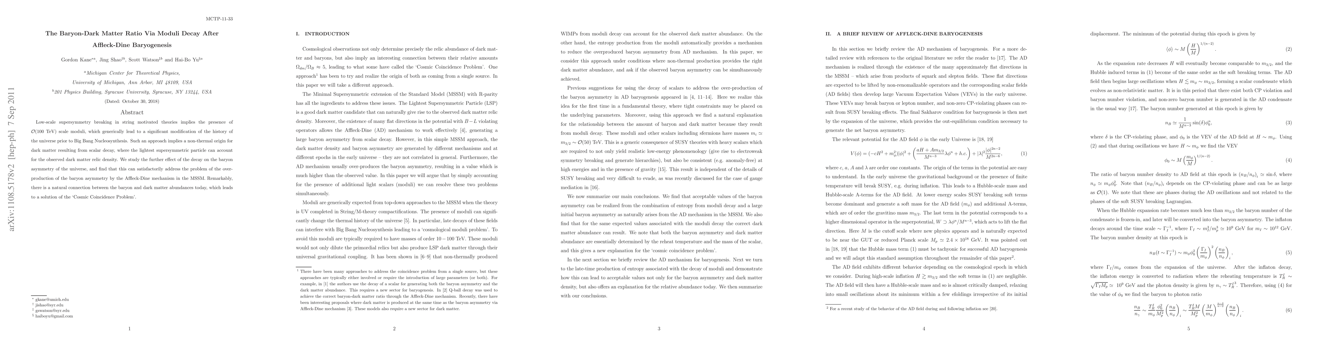 Low-scale supersymmetry breaking in string motivated theories implies the presence of O(100) TeV scale moduli, which generically lead to a significant modification of the history of the universe prior to Big Bang Nucleosynthesis. Such an approach implies a non-thermal origin for dark matter resulting from scalar decay, where the lightest supersymmetric particle can account for the observed dark matter relic density. We study the further effect of the decay on the baryon asymmetry of the universe, and find that this can satisfactorily address the problem of the over-production of the baryon asymmetry by the Affleck-Dine mechanism in the MSSM. Remarkably, there is a natural connection between the baryon and dark matter abundances today, which leads to a solution of the `Cosmic Coincidence Problem'.