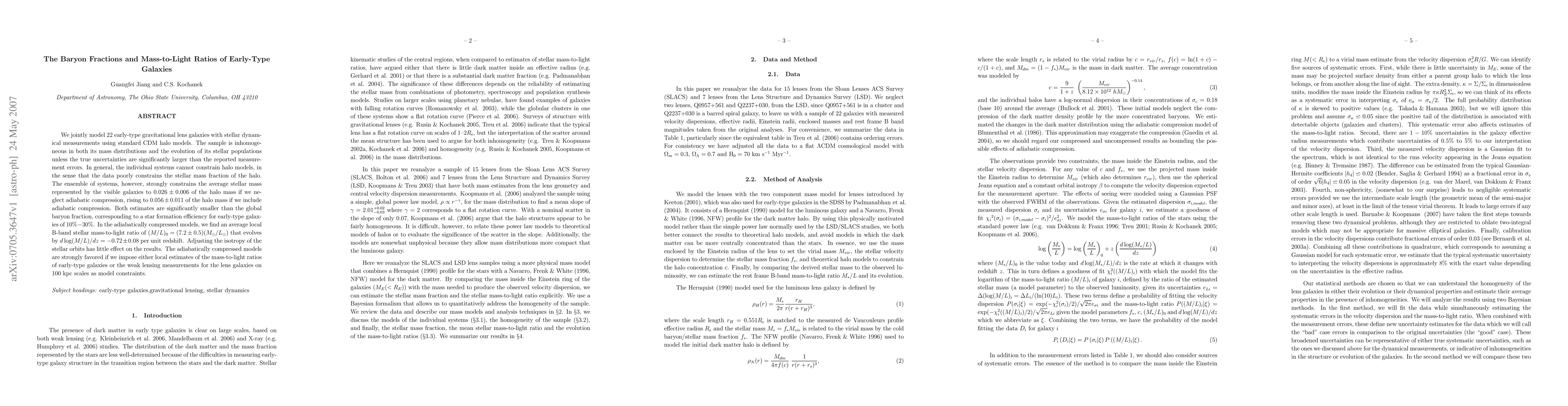 We jointly model 22 early-type gravitational lens galaxies with stellar dynamical measurements using standard CDM halo models. The sample is inhomogeneous in both its mass distributions and the evolution of its stellar populations unless the true uncertainties are significantly larger than the reported measurement errors. In general, the individual systems cannot constrain halo models, in the sense that the data poorly constrains the stellar mass fraction of the halo. The ensemble of systems, however, strongly constrains the average stellar mass represented by the visible galaxies to $0.026\pm0.006$ of the halo mass if we neglect adiabatic compression, rising to $0.056\pm0.011$ of the halo mass if we include adiabatic compression. Both estimates are significantly smaller than the global baryon fraction, corresponding to a star formation efficiency for early-type galaxies of $10%-30%$. In the adiabatically compressed models, we find an average local B-band stellar mass-to-light ratio of $(M/L)_0 = (7.2\pm0.5)(M_{\sun}/L_{\sun})$ that evolves by $d\log(M/L)/dz = -0.72\pm0.08$ per unit redshift. Adjusting the isotropy of the stellar orbits has little effect on the results. The adiabatically compressed models are strongly favored if we impose either local estimates of the mass-to-light ratios of early-type galaxies or the weak lensing measurements for the lens galaxies on 100 kpc scales as model constraints.
