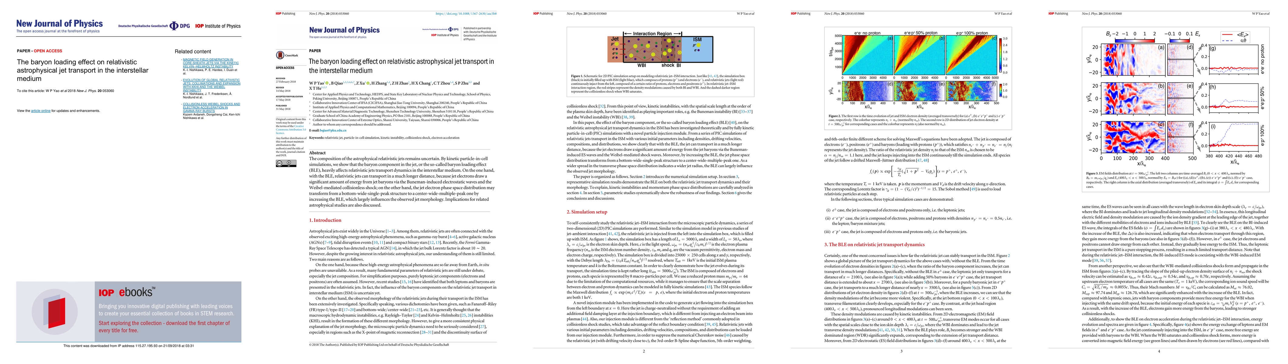 The composition of the astrophysical relativistic jets remains uncertain. By kinetic particle-in-cell simulations, we show that the baryon component in the jet, or the so-called baryon loading effect (BLE), heavily affects relativistic jets transport dynamics in the interstellar medium. On the one hand, with the BLE, relativistic jets can transport in a much longer distance, because jet electrons draw a significant amount of energy from jet baryons via the Buneman-induced electrostatic waves and the Weibel-mediated collisionless shock; on the other hand, the jet electron phase space distribution may transform from a bottom-wide-single-peak structure to a center-wide-multiple-peak one by increasing the BLE, which largely influences the observed jet morphology. Implications for related astrophysical studies are also discussed.
