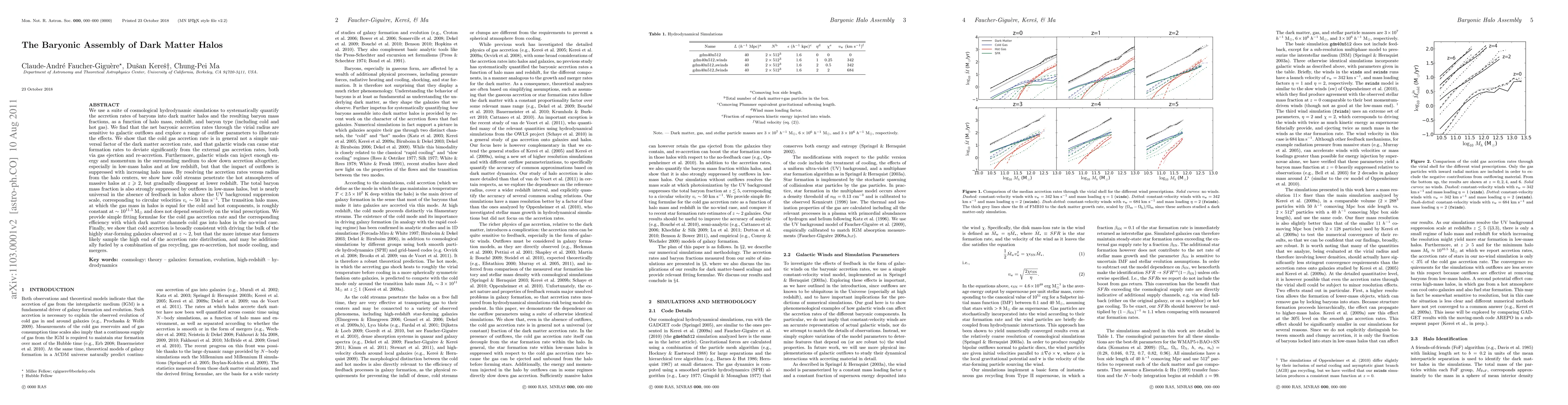 We use a suite of cosmological hydrodynamic simulations to quantify the accretion rates of baryons into dark matter halos and the resulting baryon mass fractions, as a function of halo mass, redshift, and baryon type (including cold and hot gas). We find that the net baryonic accretion rates through the virial radius are sensitive to galactic outflows and explore a range of outflow parameters to illustrate the effects. We show that the cold gas accretion rate is in general not a simple universal factor of the dark matter accretion rate, and that galactic winds can cause star formation rates to deviate significantly from the external gas accretion rates, both via gas ejection and re-accretion. Furthermore, galactic winds can inject enough energy and momentum in the surrounding medium to slow down accretion altogether, especially in low-mass halos and at low redshift. By resolving the accretion rates versus radius from the halo centers, we show how cold streams penetrate the hot atmospheres of massive halos at z>2, but gradually disappear at lower redshift. The total baryon mass fraction is also strongly suppressed by outflows in low-mass halos, but is nearly universal in the absence of feedback in halos above the UV background suppression scale. The transition halo mass, at which the gas mass in halos is equal for the cold and hot components, is roughly constant at ~10^11.5 Msun and does not depend sensitively on the wind prescription. We provide simple fitting formulae for the cold gas accretion rate into halos in the no-wind case. Finally, we show that cold accretion is broadly consistent with driving the bulk of the highly star-forming galaxies observed at z~2, but that the more intense star formers likely sample the high end of the accretion rate distribution, and may be additionally fueled by a combination of gas recycling, gas re-accretion, hot mode cooling, and mergers.