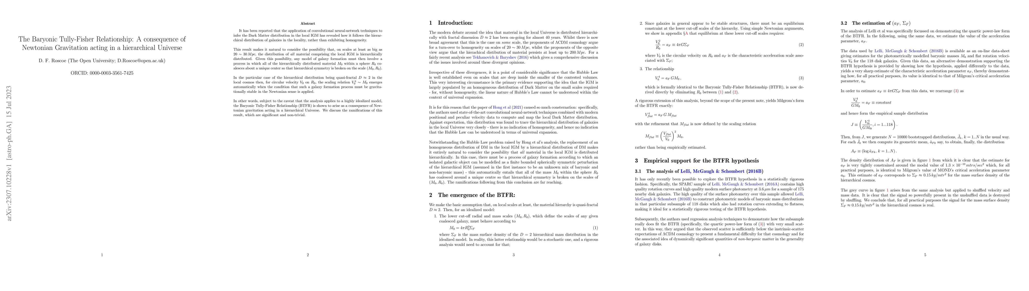 It has been reported that the application of convolutional neural-network techniques to infer the Dark Matter distribution in the local IGM has revealed how it follows the hierarchical distribution of galaxies in the locality, rather than exhibiting homogeneity. This result makes it natural to consider the possibility that, on scales at least as big as $20 \sim 30\,Mpc$, the distribution of all material comprising the local IGM is hierarchically distributed. Given this possibility, any model of galaxy formation must then involve a process in which all of the hierarchically distributed material $M_0$ within a sphere $R_0$ coalesces about a unique center so that hierarchical symmetry is broken on the scale $(M_0,R_0)$. In the particular case of the hierarchical distribution being quasi-fractal $D \approx 2$ in the local cosmos then, for circular velocity $V_0$ on $R_0$, the scaling relation $V_0^4 \sim M_0$ emerges automatically when the condition that such a galaxy formation process must be gravitationally stable in the Newtonian sense is applied. In other words, subject to the caveat that the analysis applies to a highly idealized model, the Baryonic Tully-Fisher Relationship (BTFR) is shown to arise as a consequence of Newtonian gravitation acting in a hierarchical Universe. We discuss the ramifications of this result, which are significant and non-trivial.