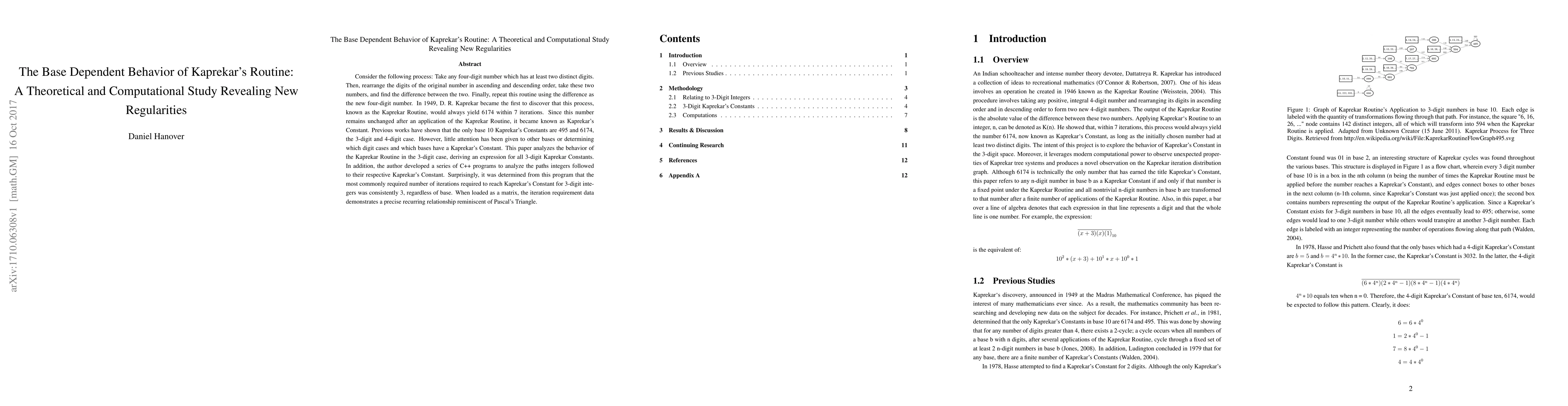 This paper explores the behavior of Kaprekar's Routine across different bases, discovering that 3-digit integers consistently reach Kaprekar's Constant in 3 iterations, regardless of base. The study reveals a recurring relationship in iteration data resembling Pascal's Triangle.