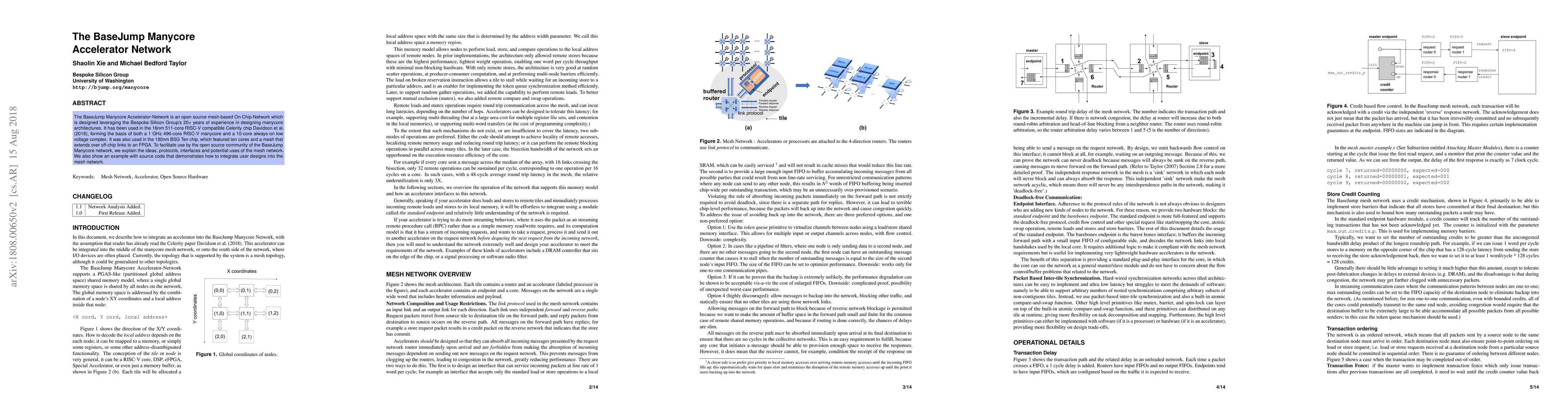 The BaseJump Manycore Accelerator Network is an open source mesh-based on-chip network designed to facilitate manycore architectures. It has been implemented in the Celerity chip and BSG Ten chip, demonstrating its versatility and potential for integration with FPGAs.
