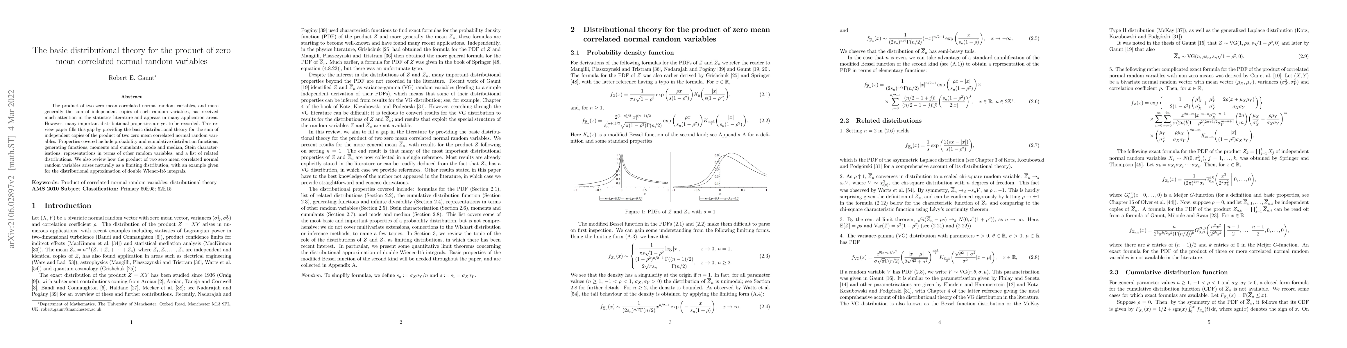 This paper reviews the foundational distributional theory for the sum of independent copies of the product of two zero mean correlated normal random variables, covering probability functions, moments, cumulants, and related distributions. It also discusses the product's emergence as a limiting distribution, exemplified by the approximation of double Wiener-Itô integrals.