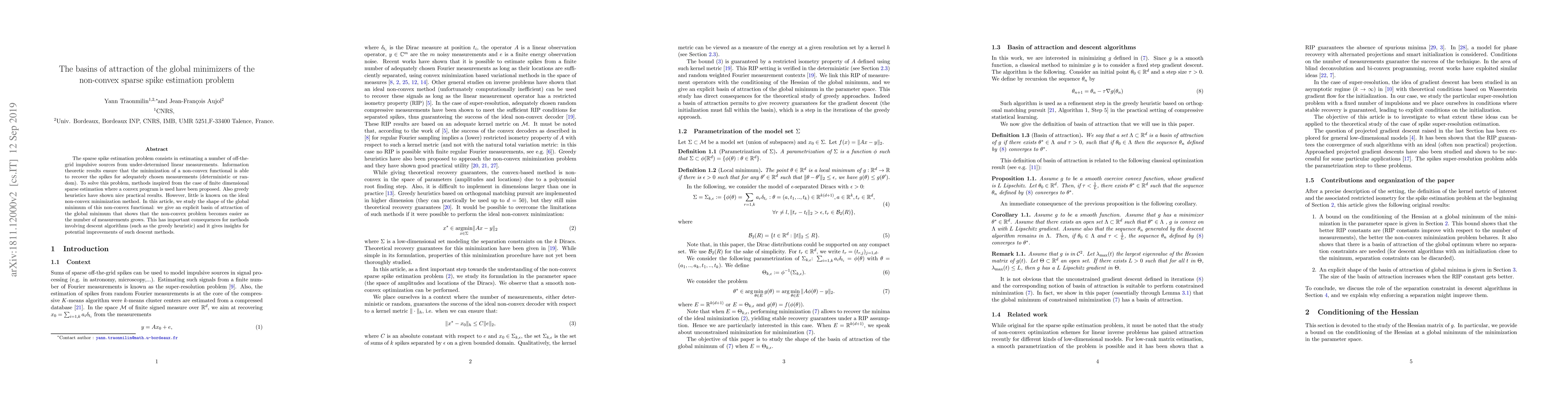 This paper explores the basins of attraction for global minimizers in the non-convex sparse spike estimation problem, demonstrating that the problem becomes easier with more measurements. It provides insights into the shape of the global minimum and suggests potential improvements for descent-based methods.