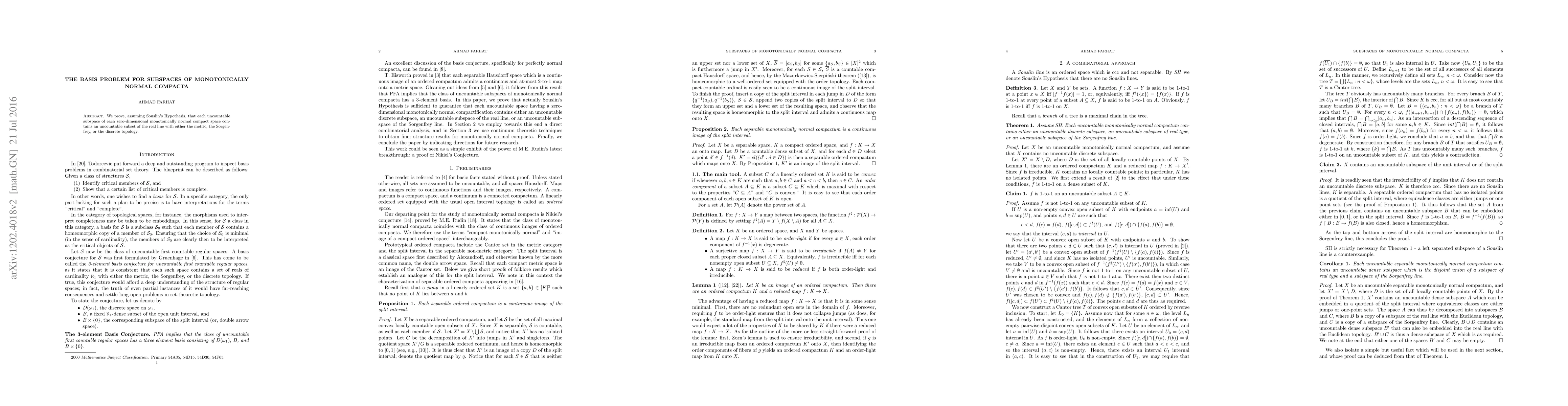 Summary: Assuming Souslin's Hypothesis, the paper proves that every uncountable subspace of a zero-dimensional monotonically normal compact space includes an uncountable subset of the real line with metric, Sorgenfrey, or discrete topology. This establishes a basis problem for such subspaces.