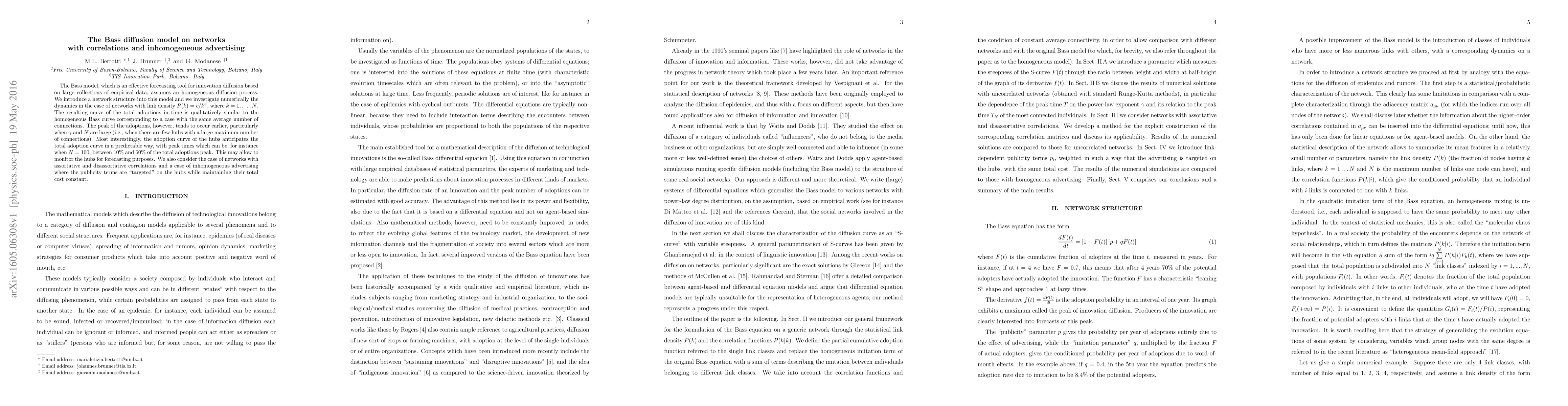 The Bass model, which is an effective forecasting tool for innovation diffusion based on large collections of empirical data, assumes an homogeneous diffusion process. We introduce a network structure into this model and we investigate numerically the dynamics in the case of networks with link density $P(k)=c/k^\gamma$, where $k=1, \ldots , N$. The resulting curve of the total adoptions in time is qualitatively similar to the homogeneous Bass curve corresponding to a case with the same average number of connections. The peak of the adoptions, however, tends to occur earlier, particularly when $\gamma$ and $N$ are large (i.e., when there are few hubs with a large maximum number of connections). Most interestingly, the adoption curve of the hubs anticipates the total adoption curve in a predictable way, with peak times which can be, for instance when $N=100$, between 10% and 60% of the total adoptions peak. This may allow to monitor the hubs for forecasting purposes. We also consider the case of networks with assortative and disassortative correlations and a case of inhomogeneous advertising where the publicity terms are "targeted" on the hubs while maintaining their total cost constant.