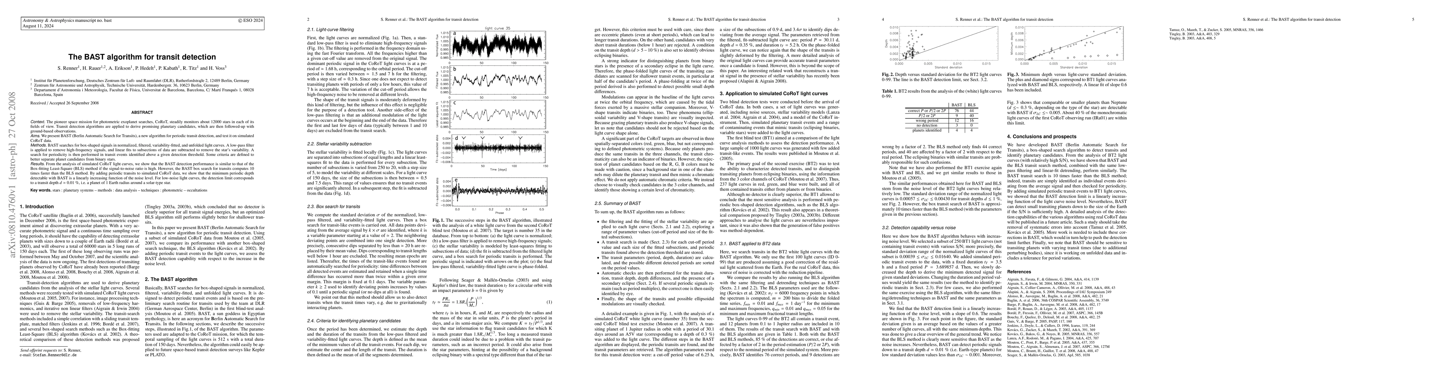 The BAST algorithm efficiently detects periodic transits in CoRoT light curves, performing a box-shaped signal search that is 10 times faster than the BLS method while maintaining comparable detection performance for high signal-to-noise ratios, with a detection limit of ~0.01% transit depth for low-noise data.