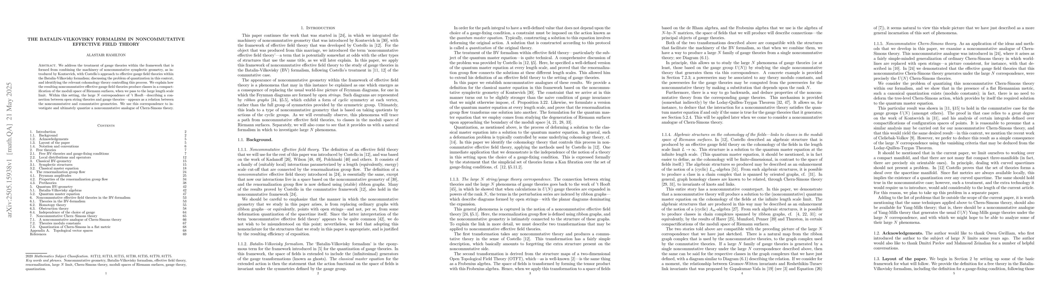 We address the treatment of gauge theories within the framework that is formed from combining the machinery of noncommutative symplectic geometry, as introduced by Kontsevich, with Costello's approach to effective gauge field theories within the Batalin-Vilkovisky formalism; discussing the problem of quantization in this context, and identifying the relevant cohomology theory controlling this process. We explain how the resulting noncommutative effective gauge field theories produce classes in a compactification of the moduli space of Riemann surfaces, when we pass to the large length scale limit. Within this setting, the large $N$ correspondence of 't Hooft -- describing a connection between open string theories and gauge theories -- appears as a relation between the noncommutative and commutative geometries. We use this correspondence to investigate and ultimately quantize a noncommutative analogue of Chern-Simons theory.