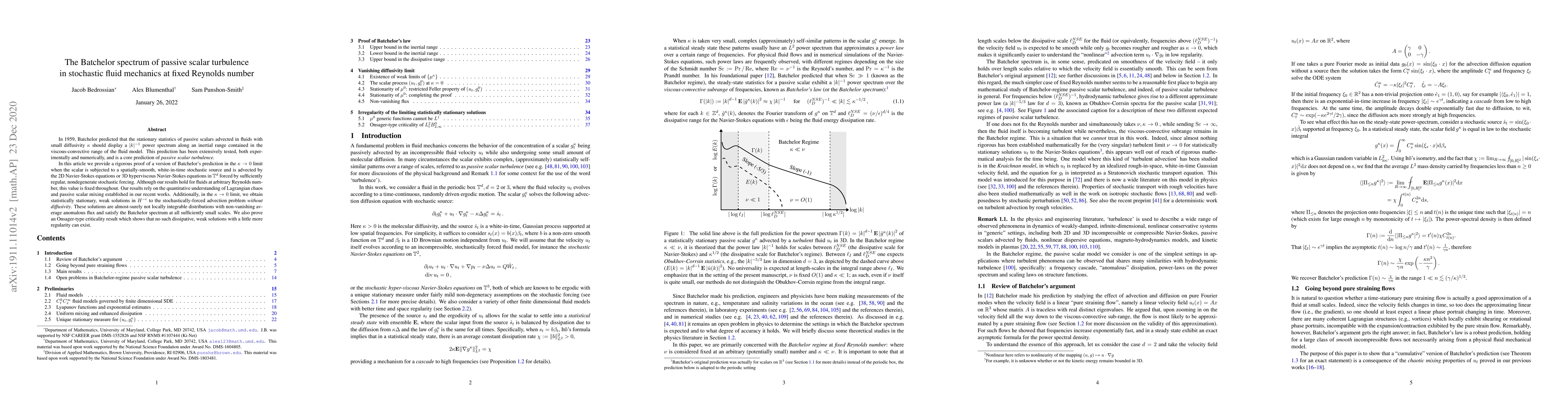 This paper rigorously proves Batchelor's prediction of a $|k|^{-1}$ power spectrum for passive scalar turbulence in stochastic fluid mechanics at a fixed Reynolds number, focusing on the $\kappa \to 0$ limit. The authors demonstrate the existence of statistically stationary, weak solutions in $H^{-\epsilon}$ that satisfy the Batchelor spectrum and prove an Onsager-type criticality result.