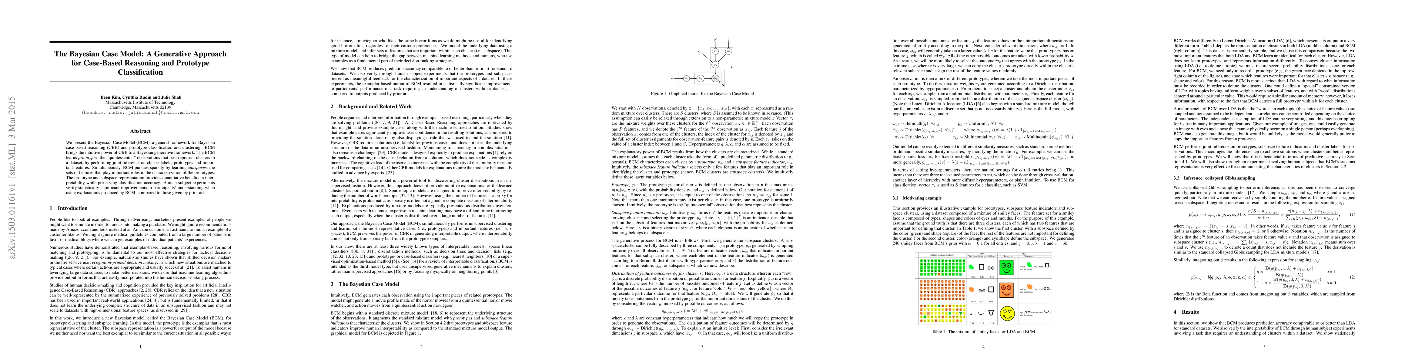 We present the Bayesian Case Model (BCM), a general framework for Bayesian case-based reasoning (CBR) and prototype classification and clustering. BCM brings the intuitive power of CBR to a Bayesian generative framework. The BCM learns prototypes, the "quintessential" observations that best represent clusters in a dataset, by performing joint inference on cluster labels, prototypes and important features. Simultaneously, BCM pursues sparsity by learning subspaces, the sets of features that play important roles in the characterization of the prototypes. The prototype and subspace representation provides quantitative benefits in interpretability while preserving classification accuracy. Human subject experiments verify statistically significant improvements to participants' understanding when using explanations produced by BCM, compared to those given by prior art.