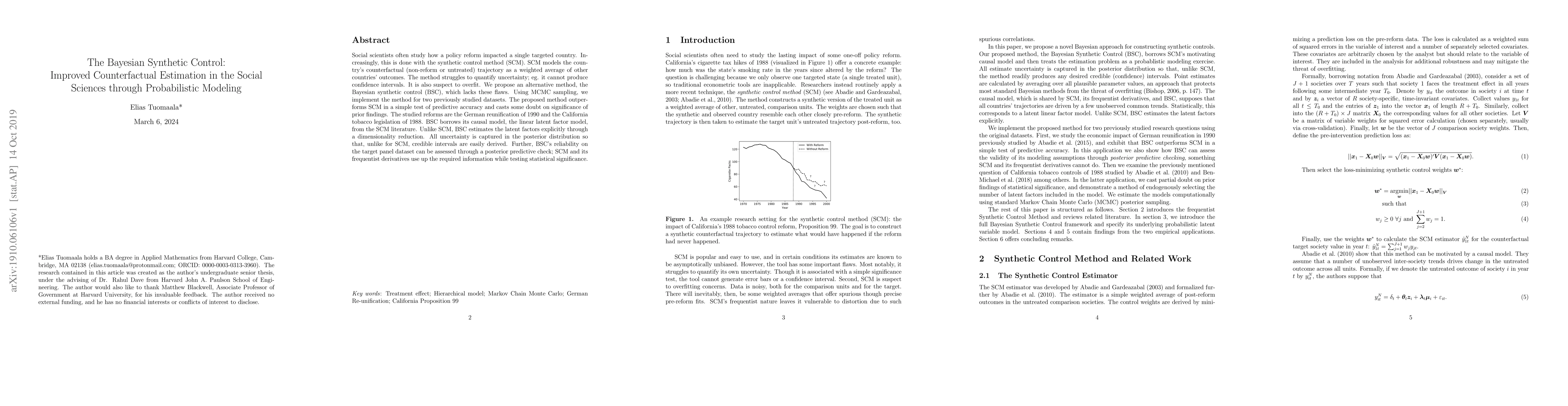 Social scientists often study how a policy reform impacted a single targeted country. Increasingly, this is done with the synthetic control method (SCM). SCM models the country's counterfactual (non-reform or untreated) trajectory as a weighted average of other countries' outcomes. The method struggles to quantify uncertainty; eg. it cannot produce confidence intervals. It is also suspect to overfit. We propose an alternative method, the Bayesian synthetic control (BSC), which lacks these flaws. Using MCMC sampling, we implement the method for two previously studied datasets. The proposed method outperforms SCM in a simple test of predictive accuracy and casts some doubt on significance of prior findings. The studied reforms are the German reunification of 1990 and the California tobacco legislation of 1988. BSC borrows its causal model, the linear latent factor model, from the SCM literature. Unlike SCM, BSC estimates the latent factors explicitly through a dimensionality reduction. All uncertainty is captured in the posterior distribution so that, unlike for SCM, credible intervals are easily derived. Further, BSC's reliability on the target panel dataset can be assessed through a posterior predictive check; SCM and its frequentist derivatives use up the required information while testing statistical significance.