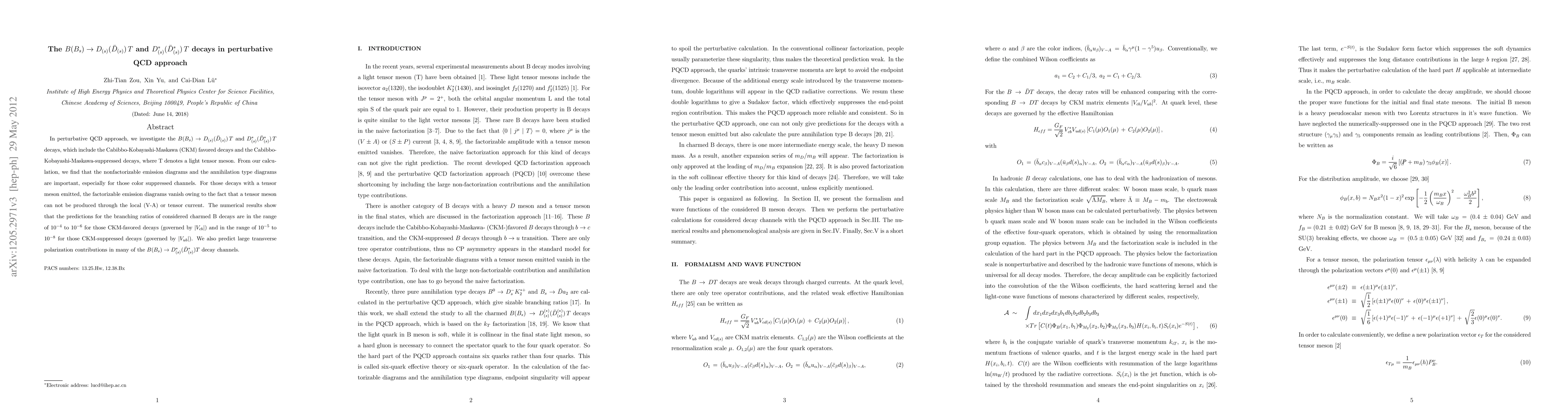 This paper investigates $B(B_{s}) \rightarrow D_{(s)}(\bar{D}_{(s)}) T$ and $D_{(s)}^{*}(\bar{D}_{(s)}^{*})T$ decays using perturbative QCD, finding significant contributions from nonfactorizable and annihilation diagrams, especially for color-suppressed channels. The branching ratios for CKM-favored decays range from $10^{-4}$ to $10^{-6}$, while CKM-suppressed decays range from $10^{-5}$ to $10^{-8}$, and large transverse polarization contributions are predicted.