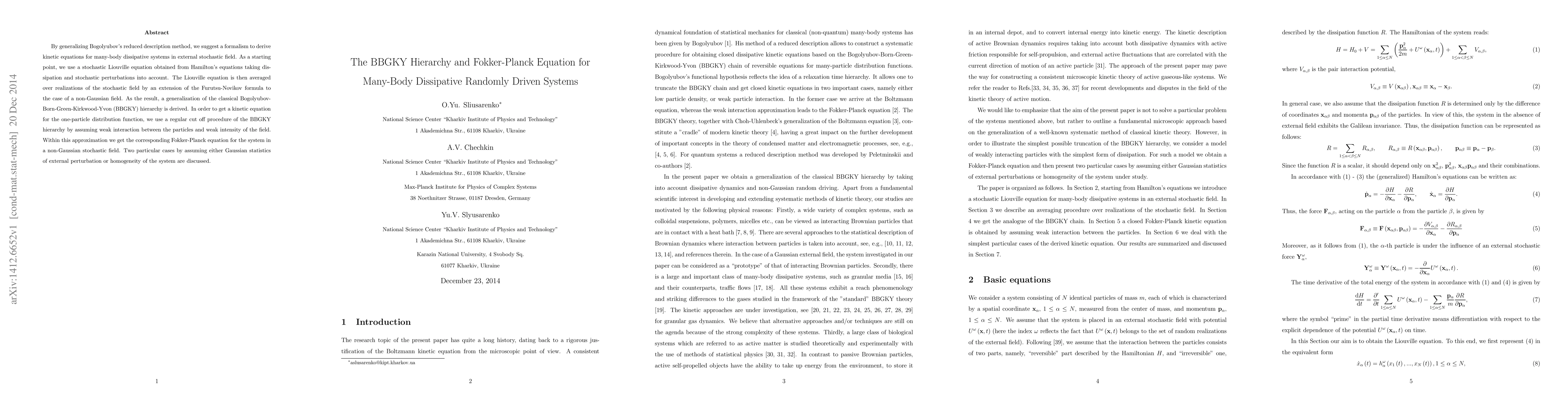 The novelty lies in the generalization of the BBGKY hierarchy and the derivation of a Fokker-Planck equation for weakly interacting particles in non-Gaussian stochastic fields, providing a comprehensive framework for understanding dissipative many-body systems under complex external driving forces.
