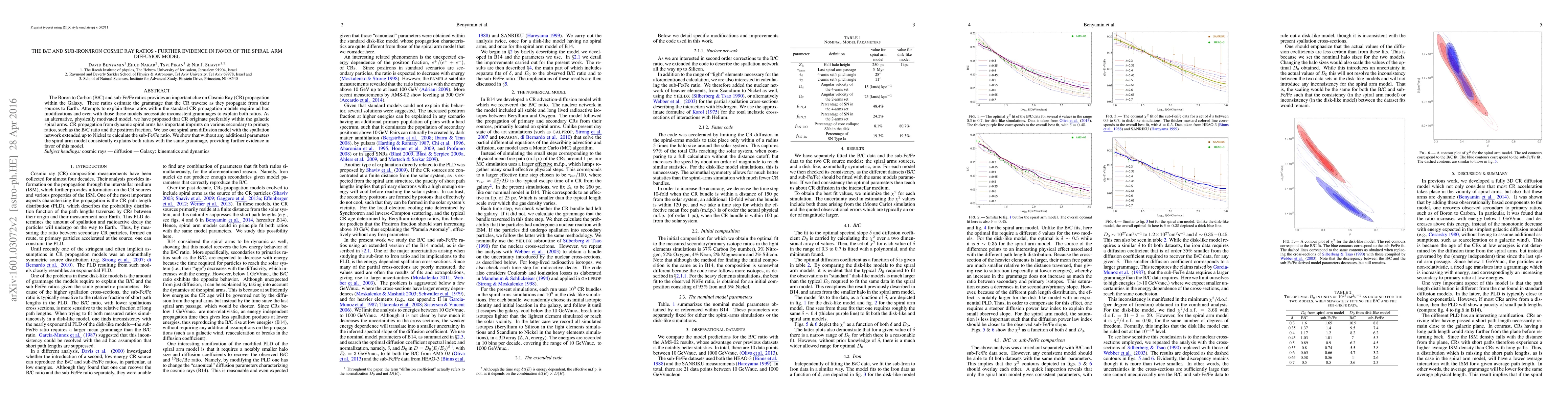 This paper demonstrates that the spiral arm diffusion model effectively explains the Boron to Carbon (B/C) and sub-Iron to Iron (sub-Fe/Fe) cosmic ray ratios without requiring ad hoc modifications, supporting the model's validity for cosmic ray propagation within the galaxy.