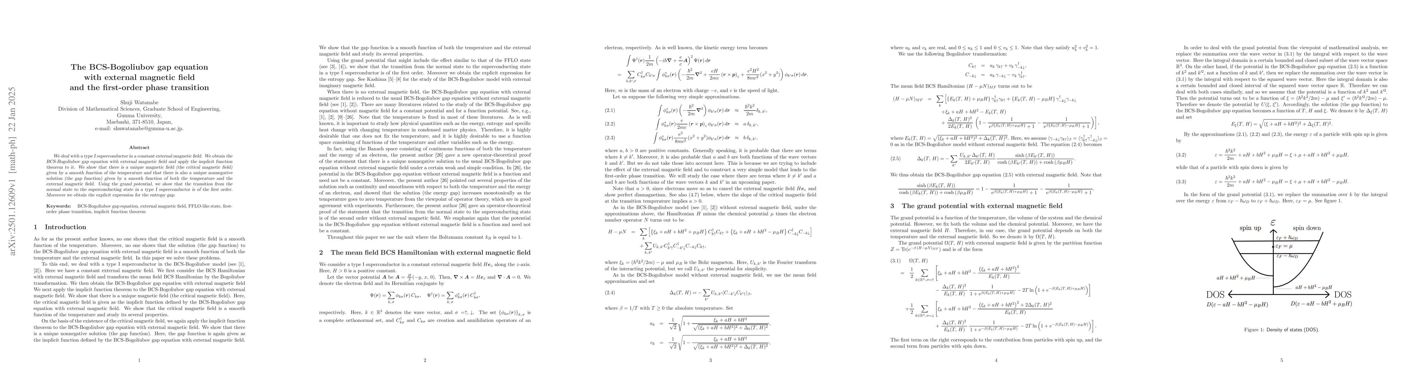 This paper investigates a type I superconductor under an external magnetic field, deriving the BCS-Bogoliubov gap equation and demonstrating the existence of a critical magnetic field that triggers a first-order phase transition, alongside an explicit expression for the entropy gap.