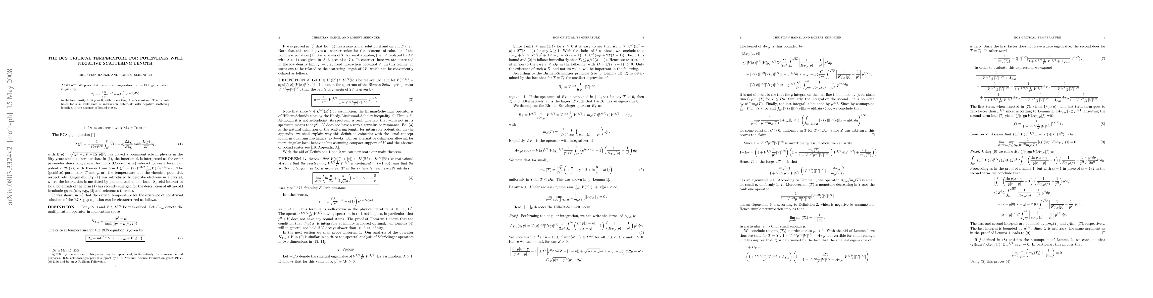 We prove that the critical temperature for the BCS gap equation is given by $T_c = \mu (8/\pi e^{\gamma -2} + o(1)) e^{\pi/(2\sqrt \mu a)}$ in the low density limit $\mu\to 0$. The formula holds for a suitable class of interaction potentials with negative scattering length $a$ in the absence of bound states.