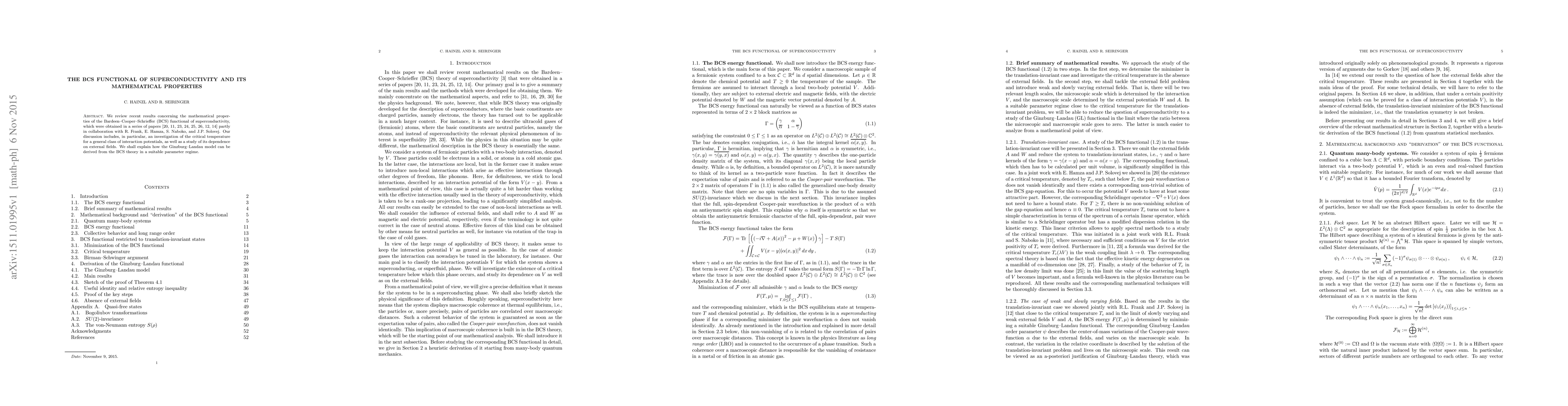 We review recent results concerning the mathematical properties of the Bardeen-Cooper-Schrieffer (BCS) functional of superconductivity, which were obtained in a series of papers partly in collaboration with R. Frank, E. Hamza, S. Naboko, and J.P. Solovej. Our discussion includes, in particular, an investigation of the critical temperature for a general class of interaction potentials, as well as a study of its dependence on external fields. We shall explain how the Ginzburg-Landau model can be derived from the BCS theory in a suitable parameter regime.