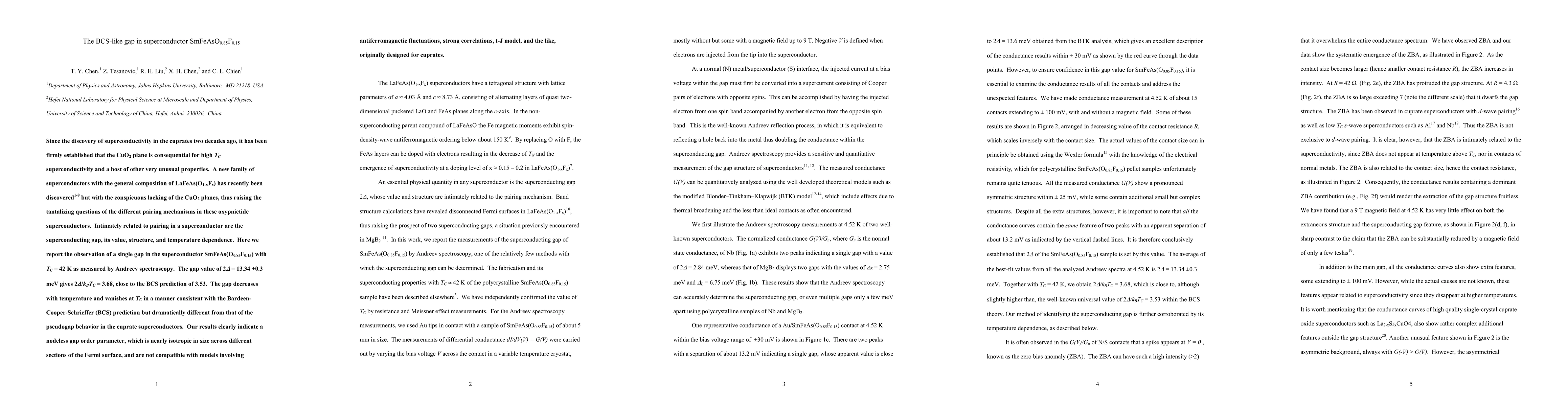 This paper reports the discovery of a single BCS-like superconducting gap in SmFeAsO_0.85F_0.15 with a critical temperature of 42 K, measured via Andreev spectroscopy. The gap value aligns closely with the BCS prediction, indicating a nodeless and nearly isotropic gap structure, contrasting with the pseudogap behavior in cuprate superconductors.