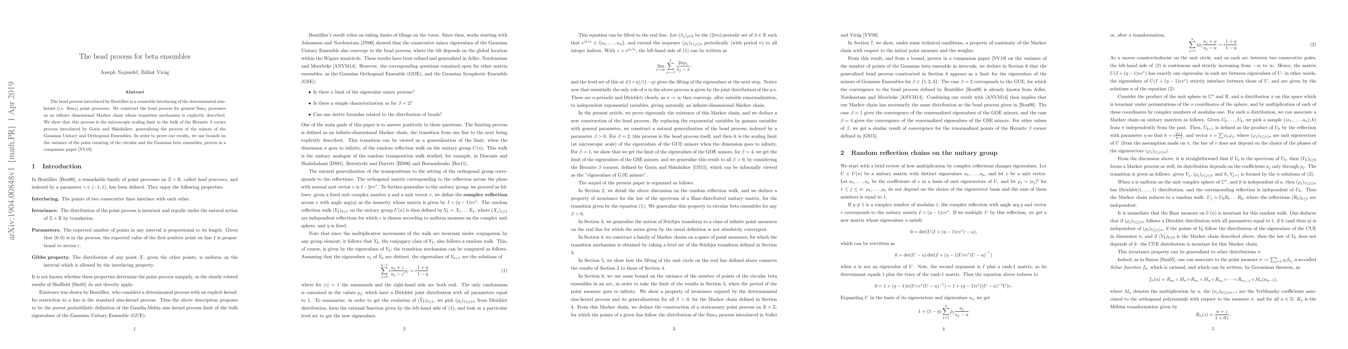The bead process introduced by Boutillier is a countable interlacing of the determinantal sine-kernel point processes. We construct the bead process for general sine beta processes as an infinite dimensional Markov chain whose transition mechanism is explicitly described. We show that this process is the microscopic scaling limit in the bulk of the Hermite beta corner process introduced by Gorin and Shkolnikov, generalizing the process of the minors of the Gaussian unitary and orthogonal ensembles. In order to prove our results, we use bounds on the variance of the point counting of the circular and the Gaussian beta ensembles, proven in a companion paper.