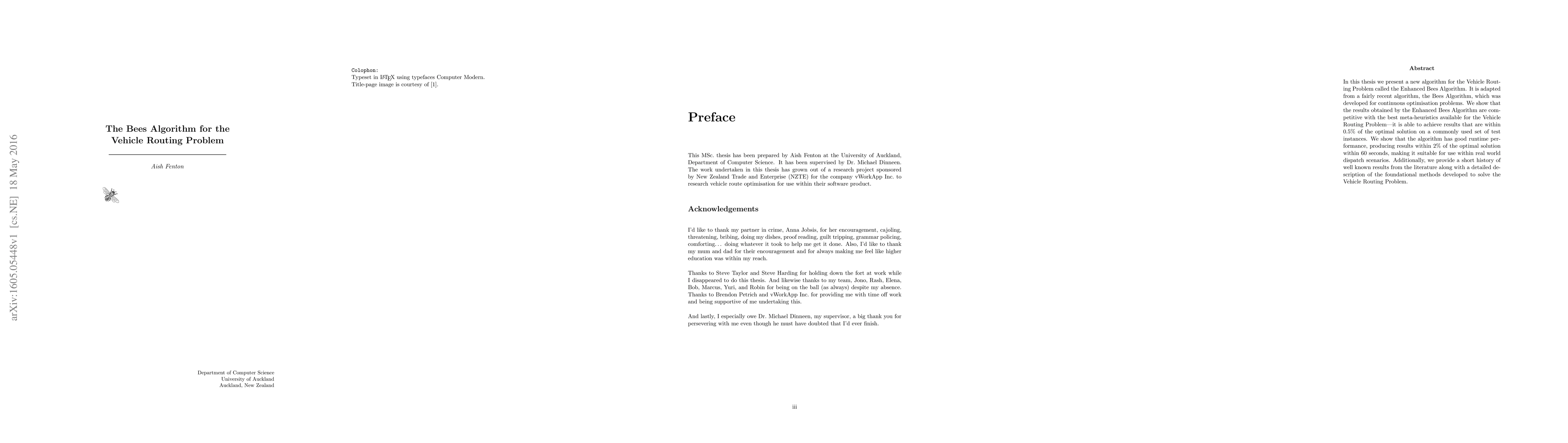 In this thesis we present a new algorithm for the Vehicle Routing Problem called the Enhanced Bees Algorithm. It is adapted from a fairly recent algorithm, the Bees Algorithm, which was developed for continuous optimisation problems. We show that the results obtained by the Enhanced Bees Algorithm are competitive with the best meta-heuristics available for the Vehicle Routing Problem (within 0.5% of the optimal solution for common benchmark problems). We show that the algorithm has good runtime performance, producing results within 2% of the optimal solution within 60 seconds, making it suitable for use within real world dispatch scenarios.