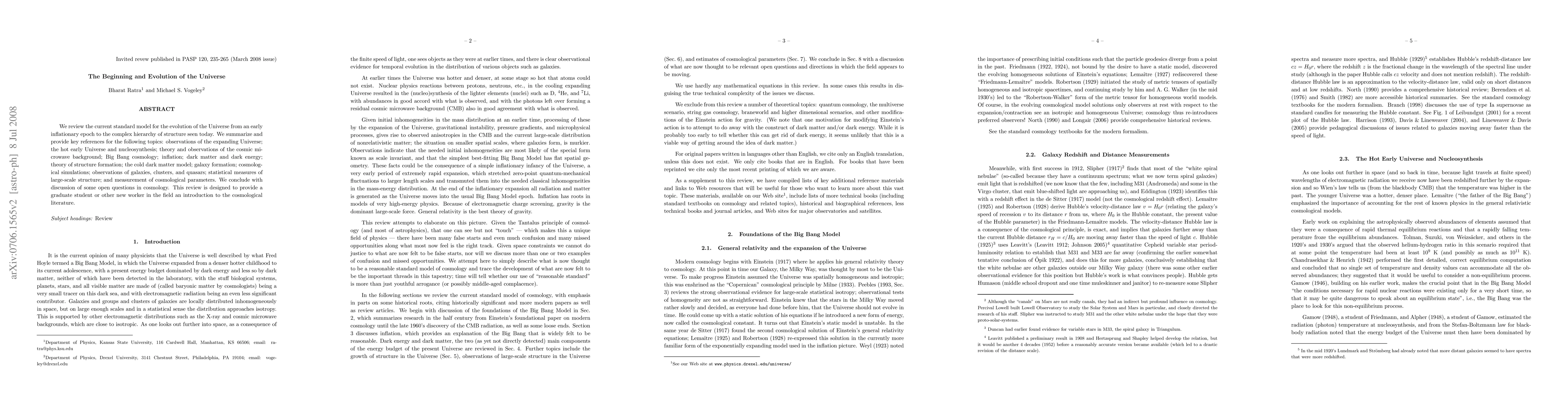 We review the current standard model for the evolution of the Universe from an early inflationary epoch to the complex hierarchy of structure seen today. We summarize and provide key references for the following topics: observations of the expanding Universe; the hot early Universe and nucleosynthesis; theory and observations of the cosmic microwave background; Big Bang cosmology; inflation; dark matter and dark energy; theory of structure formation; the cold dark matter model; galaxy formation; cosmological simulations; observations of galaxies, clusters, and quasars; statistical measures of large-scale structure; and measurement of cosmological parameters. We conclude with discussion of some open questions in cosmology. This review is designed to provide a graduate student or other new worker in the field an introduction to the cosmological literature.