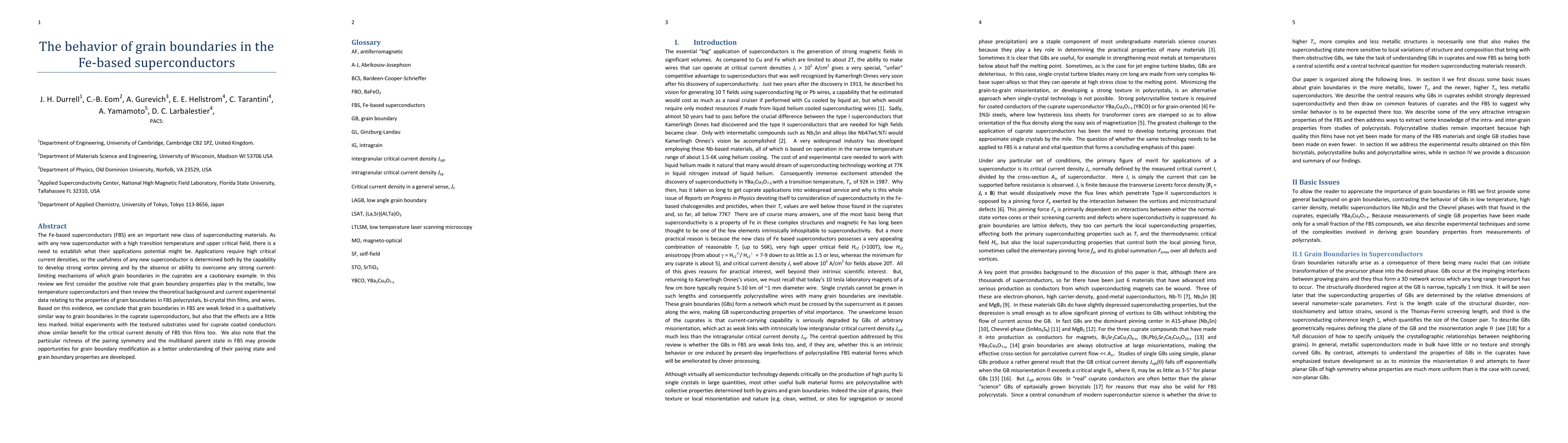 The Fe-based superconductors (FBS) are an important new class of superconducting materials. As with any new superconductor with a high transition temperature and upper critical field, there is a need to establish what their applications potential might be. Applications require high critical current densities, so the usefulness of any new superconductor is determined both by the capability to develop strong vortex pinning and by the absence or ability to overcome any strong current-limiting mechanisms of which grain boundaries in the cuprates are a cautionary example. In this review we first consider the positive role that grain boundary properties play in the metallic, low temperature superconductors and then review the theoretical background and current experimental data relating to the properties of grain boundaries in FBS polycrystals, bi-crystal thin films, and wires. Based on this evidence, we conclude that grain boundaries in FBS are weak linked in a qualitatively similar way to grain boundaries in the cuprate superconductors, but also that the effects are a little less marked. Initial experiments with the textured substrates used for cuprate coated conductors show similar benefit for the critical current density of FBS thin films too. We also note that the particular richness of the pairing symmetry and the multiband parent state in FBS may provide opportunities for grain boundary modification as a better understanding of their pairing state and grain boundary properties are developed.