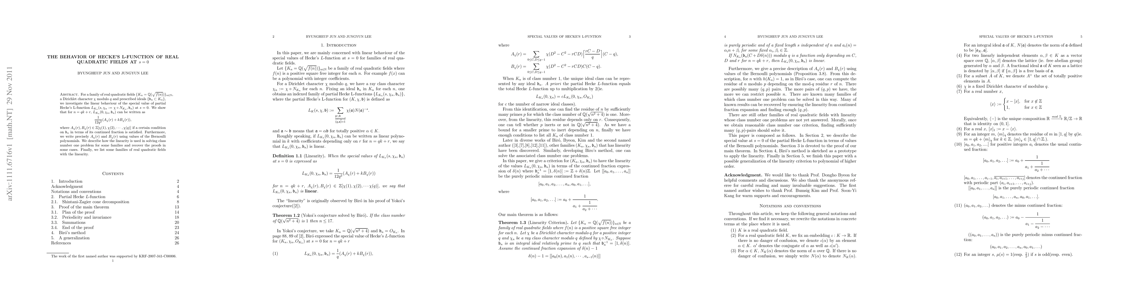 For a family of real quadratic fields $\{K_n=\FQ(\sqrt{f(n)})\}_{n\in \FN}$, a Dirichlet character $\chi$ modulo $q$ and prescribed ideals $\{\fb_n\subset K_n\}$, we investigate the linear behaviour of the special value of partial Hecke's L-function $L_{K_n}(s,\chi_n:=\chi\circ N_{K_n},\fb_n)$ at $s=0$. We show that for $n=qk+r$, $L_{K_n}(0,\chi_n,\fb_n)$ can be written as $$\frac{1}{12q^2}(A_{\chi}(r)+kB_{\chi}(r)),$$ where $A_{\chi}(r),B_{\chi}(r)\in \FZ[\chi(1),\chi(2),..., \chi(q)]$ if a certain condition on $\fb_n$ in terms of its continued fraction is satisfied. Furthermore, we write precisely $A_{\chi}(r)$ and $B_{\chi}(r)$ using values of the Bernoulli polynomials. We describe how the linearity is used in solving class number one problem for some families and recover the proofs in some cases. Finally, we list some families of real quadratic fields with the linearity.