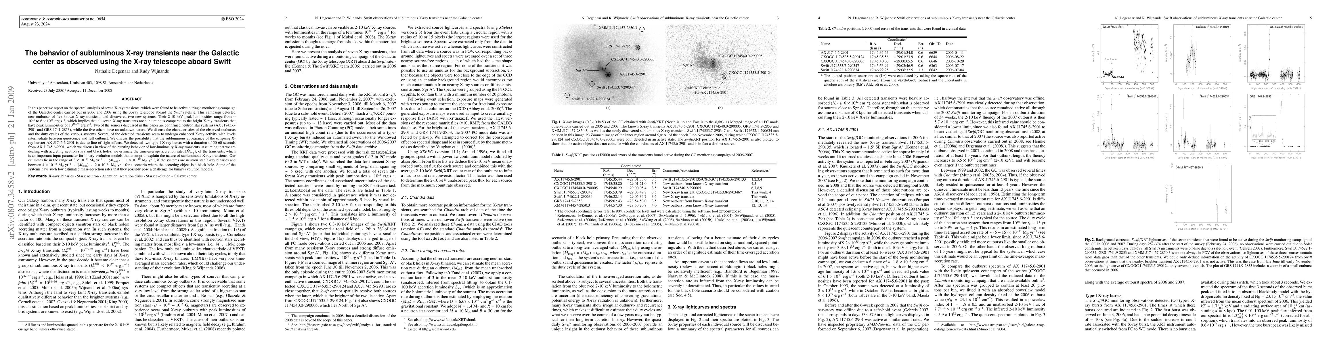 This paper analyzes the spectral characteristics of seven subluminous X-ray transients near the Galactic center, detected during a 2006-2007 monitoring campaign using Swift's X-ray telescope. The study estimates accretion rates and discusses the nature and outburst behavior of these transients, highlighting potential challenges for binary evolution models.