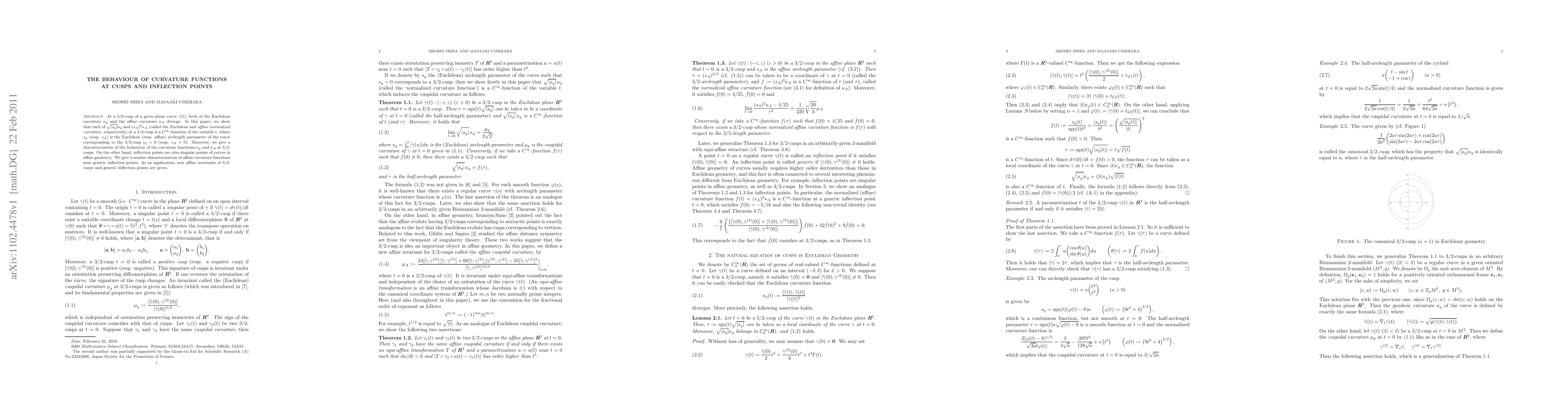 At a 3/2-cusp of a given plane curve $\gamma(t)$, both of the Euclidean curvature $\kappa_g$ and the affine curvature $\kappa_A$ diverge. In this paper, we show that each of $\sqrt{|s_g|}\kappa_g$ and $(s_A)^2 \kappa_A$ (called the Euclidean and affine normalized curvature, respectively) at a 3/2-cusp is a smooth function of the variable $t$, where $s_g$ (resp. $s_A$) is the Euclidean (resp. affine) arclength parameter of the curve corresponding to the 3/2-cusp $s_g=0$ (resp. $s_A=0$). Moreover, we give a characterization of the behaviour of the curvature functions $\kappa_g$ and $\kappa_A$ at 3/2-cusps. On the other hand, inflection points are also singular points of curves in affine geometry. We give a similar characterization of affine curvature functions near generic inflection points. As an application, new affine invariants of 3/2-cusps and generic inflection points are given.