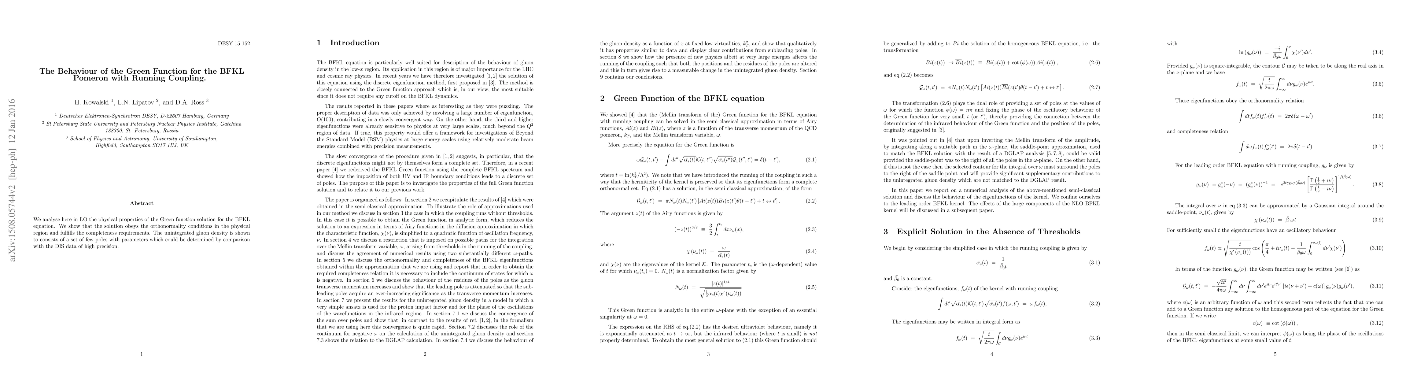 We analyse here in LO the physical properties of the Green function solution for the BFKL equation. We show that the solution obeys the orthonormality conditions in the physical region and fulfills the completeness requirements. The unintegrated gluon density is shown to consists of a set of few poles with parameters which could be determined by comparison with the DIS data of high precision.