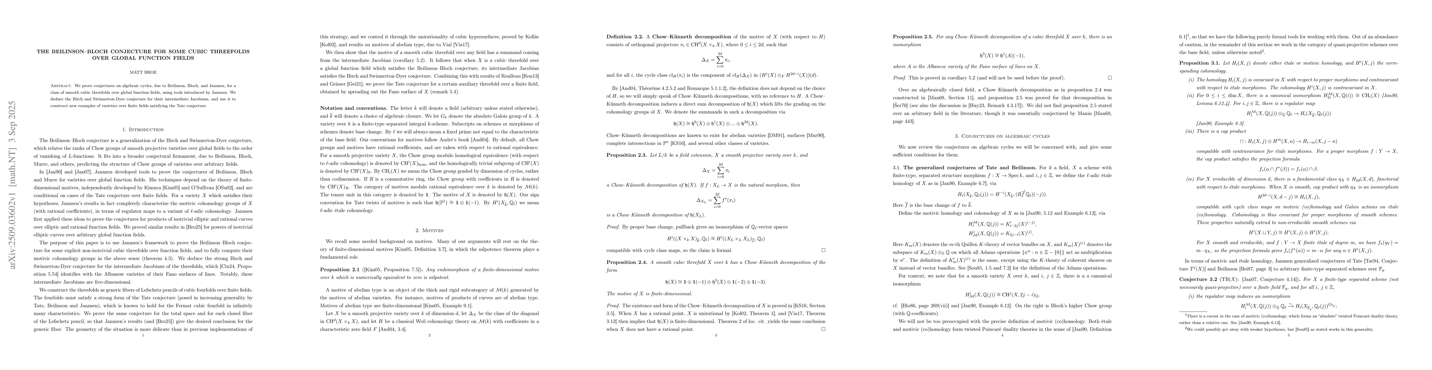 We prove conjectures on algebraic cycles, due to Beilinson, Bloch, and Jannsen, for a class of smooth cubic threefolds over global function fields, using tools introduced by Jannsen. We deduce the Birch and Swinnerton-Dyer conjecture for their intermediate Jacobians, and use it to construct new examples of varieties over finite fields satisfying the Tate conjecture.
