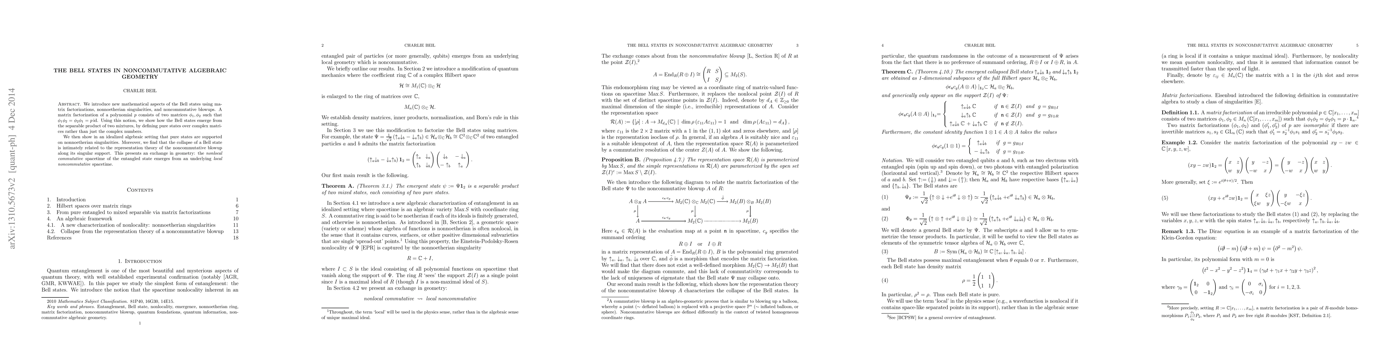 This paper explores the Bell states through the lens of noncommutative algebraic geometry, utilizing matrix factorizations and nonnoetherian singularities. It reveals that Bell states arise from the separable product of mixtures and are supported on nonnoetherian singularities, with their collapse linked to the representation theory of noncommutative blowups.