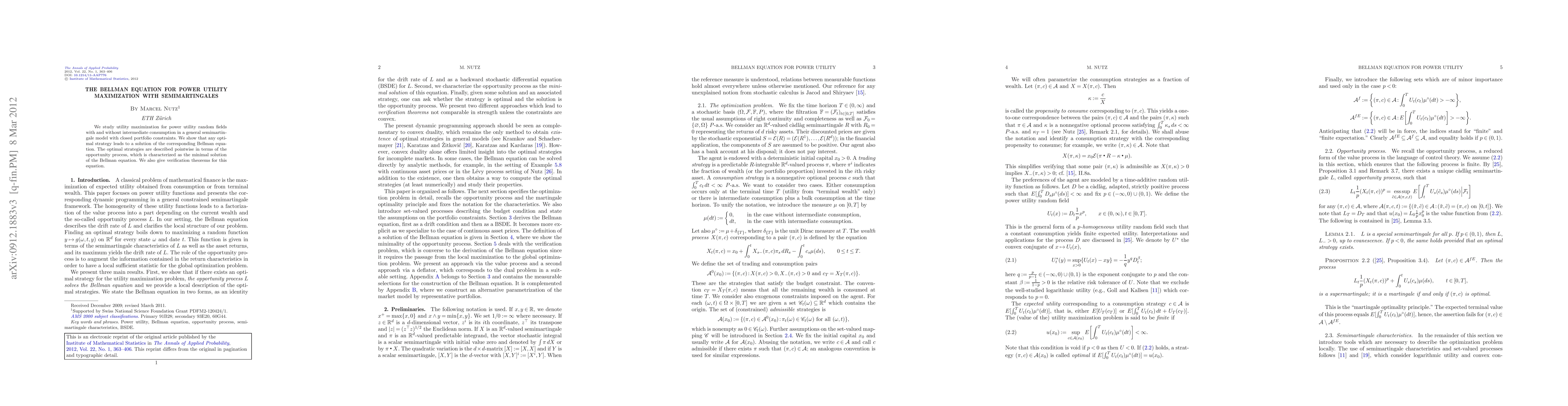 We study utility maximization for power utility random fields with and without intermediate consumption in a general semimartingale model with closed portfolio constraints. We show that any optimal strategy leads to a solution of the corresponding Bellman equation. The optimal strategies are described pointwise in terms of the opportunity process, which is characterized as the minimal solution of the Bellman equation. We also give verification theorems for this equation.