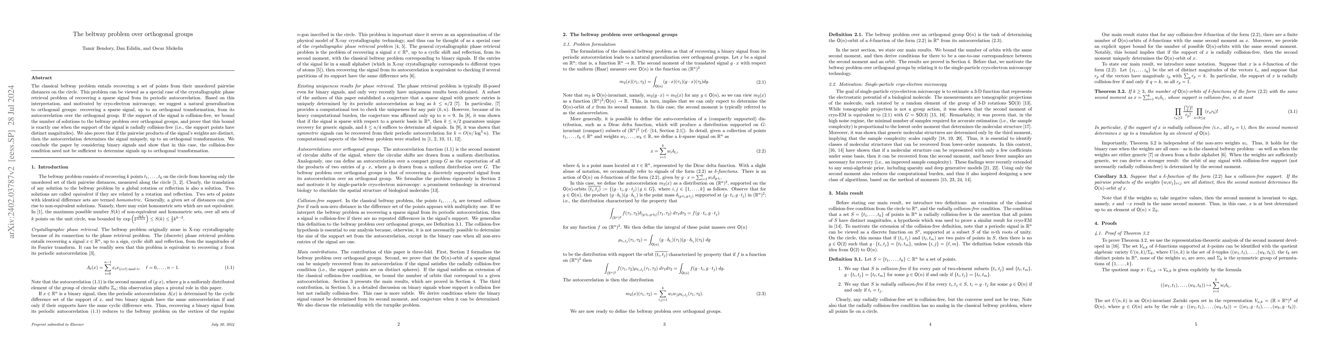 This paper generalizes the beltway problem to orthogonal groups, focusing on recovering sparse signals from their autocorrelations. It proves that under certain conditions, such as radially collision-free support, the signal can be uniquely determined, up to an orthogonal transformation. However, for binary signals, the collision-free condition alone is insufficient for unique determination.