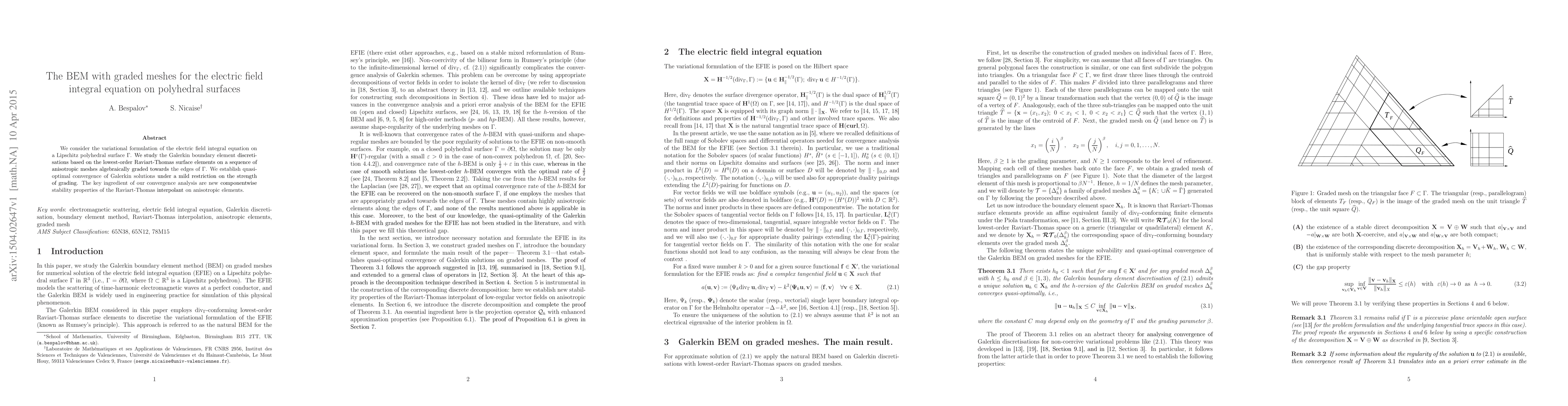 This paper explores the BEM for the electric field integral equation on polyhedral surfaces using graded meshes. It establishes quasi-optimal convergence for the Galerkin discretisation, relying on new componentwise stability properties of the Raviart-Thomas interpolant on anisotropic elements.