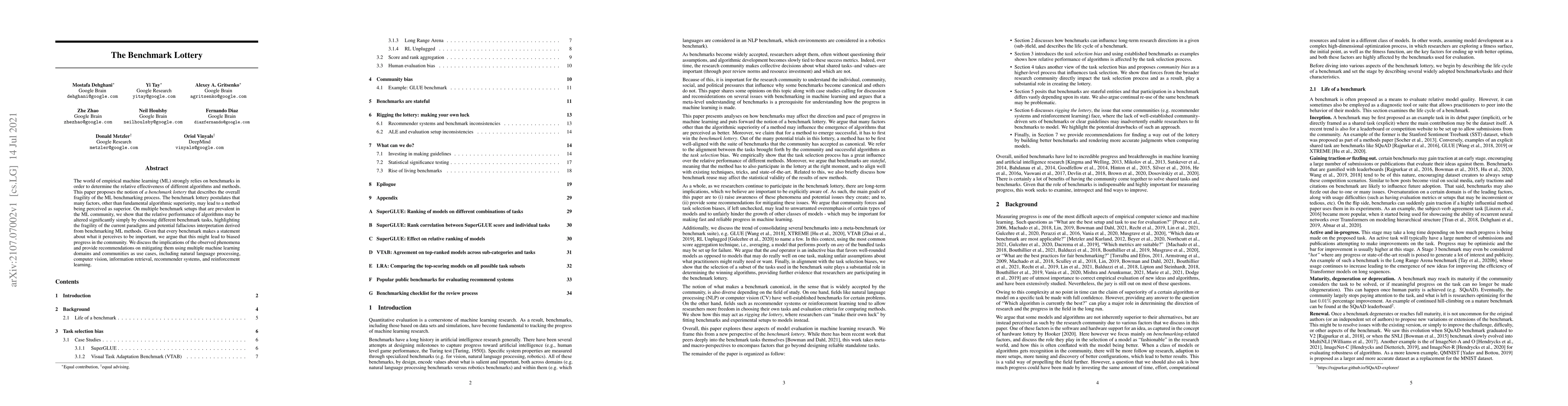 The world of empirical machine learning (ML) strongly relies on benchmarks in order to determine the relative effectiveness of different algorithms and methods. This paper proposes the notion of "a benchmark lottery" that describes the overall fragility of the ML benchmarking process. The benchmark lottery postulates that many factors, other than fundamental algorithmic superiority, may lead to a method being perceived as superior. On multiple benchmark setups that are prevalent in the ML community, we show that the relative performance of algorithms may be altered significantly simply by choosing different benchmark tasks, highlighting the fragility of the current paradigms and potential fallacious interpretation derived from benchmarking ML methods. Given that every benchmark makes a statement about what it perceives to be important, we argue that this might lead to biased progress in the community. We discuss the implications of the observed phenomena and provide recommendations on mitigating them using multiple machine learning domains and communities as use cases, including natural language processing, computer vision, information retrieval, recommender systems, and reinforcement learning.