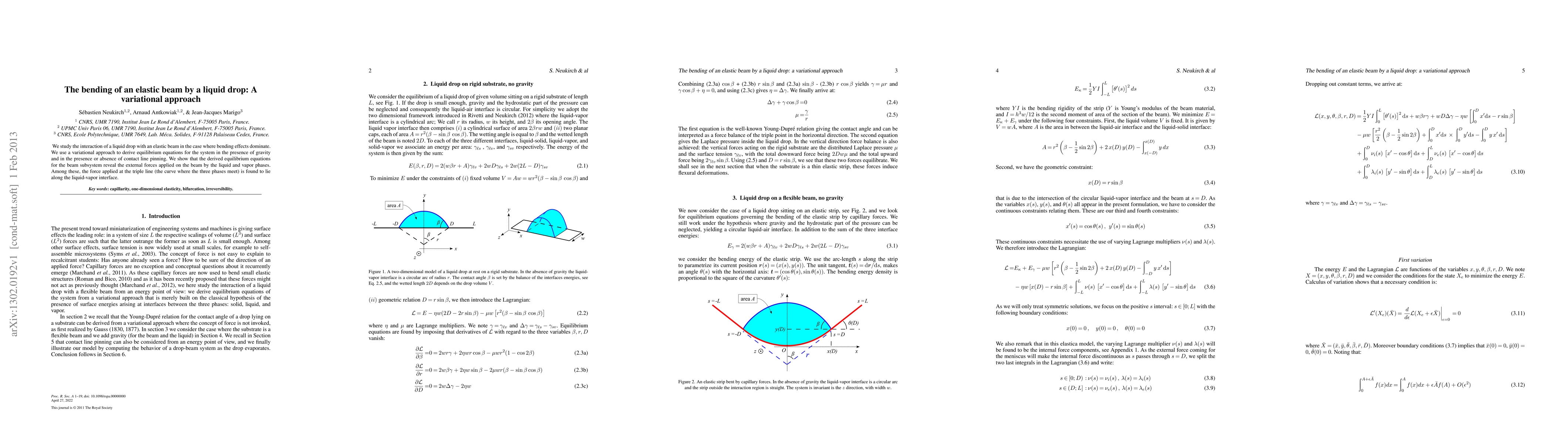 We study the interaction of a liquid drop with an elastic beam in the case where bending effects dominate. We use a variational approach to derive equilibrium equations for the system in the presence of gravity and in the presence or absence of contact line pinning. We show that the derived equilibrium equations for the beam subsystem reveal the external forces applied on the beam by the liquid and vapor phases. Among these, the force applied at the triple line (the curve where the three phases meet) is found to lie along the liquid-vapor interface.