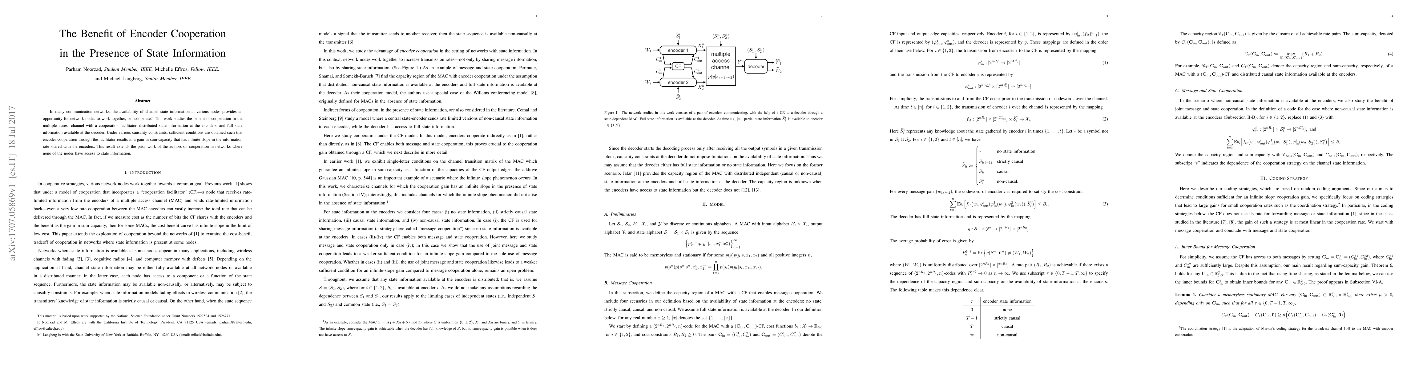 This paper investigates the benefits of encoder cooperation in communication networks where nodes have access to channel state information, showing that cooperation through a facilitator can significantly increase sum-capacity, especially under certain causality constraints. The study extends previous findings on cooperation in networks without state information.