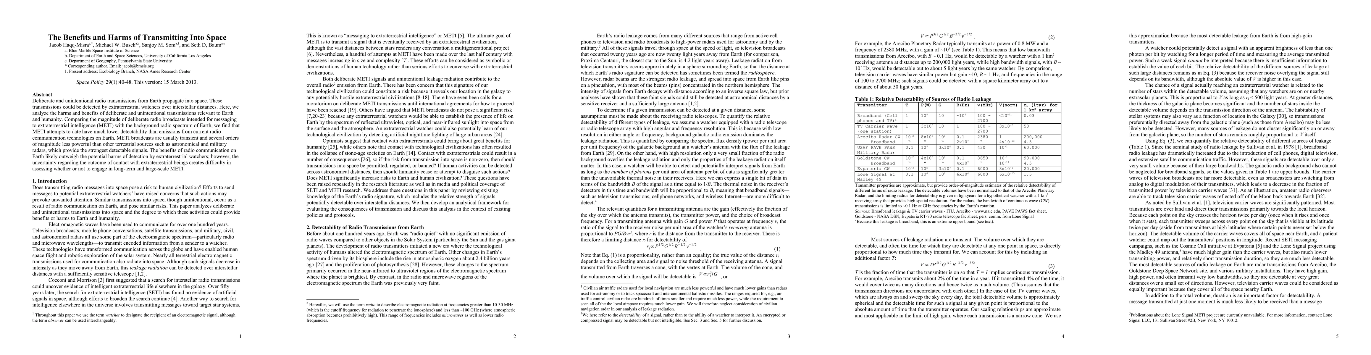 This paper examines the pros and cons of Earth's radio transmissions into space, finding that deliberate messages to extraterrestrial intelligence (METI) are far less detectable than routine terrestrial radio emissions. While the benefits of Earth's radio communications are substantial, the uncertainty of extraterrestrial contact complicates the decision to engage in METI.